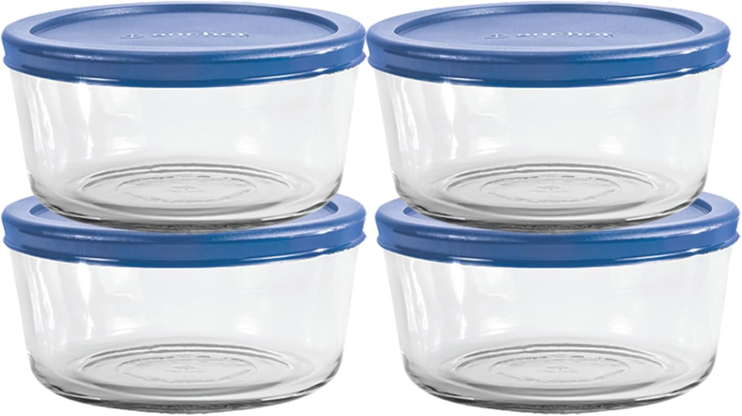 Anchor Hocking 7-Cup Round Glass Food Storage Containers with Navy Blue SnugFitTM lids are a kitchen essential. BPA-free plastic lids sit on glass containers that are extra-durable. The two pieces join together smoothly and tightly to store, transport, and reheat all manner of lunches, leftovers, and more. This versatile set includes four 7-cup round containers perfect for meal prep, leftovers, and pantry organization. Glass is dishwasher (lids are top-rack safe), microwave, fridge/freezer, and oven safe up to 425°F. The striking navy blue lids add a contemporary touch to these practical kitchen essentials while providing a secure, reliable seal.