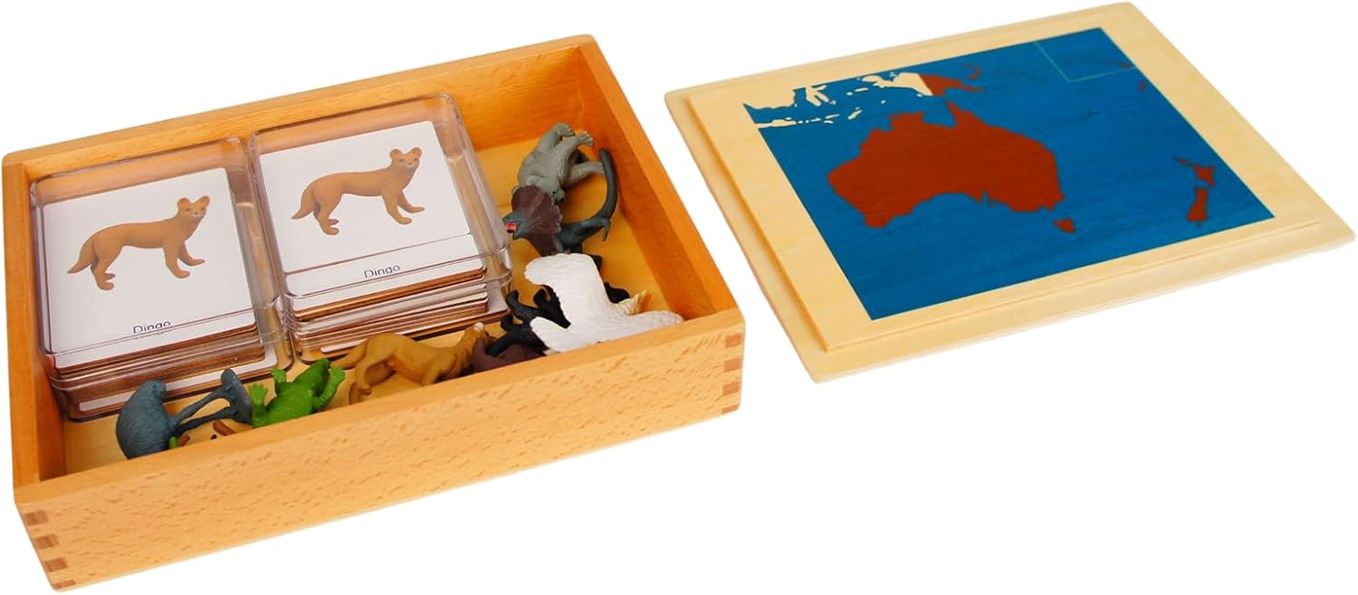 Discover the fascinating world of Australian wildlife with this comprehensive Montessori learning set. The beautifully crafted wooden box contains detailed miniature animal figures representing Australia's unique fauna, paired with matching identification cards. This educational geography game features a world map design that helps children learn about animal habitats while developing their matching and memory skills. The set includes various Australian animals like kangaroos, koalas, and other native species, each carefully designed to spark curiosity and engagement. The sturdy wooden storage box keeps all components organized and protected. Perfect for hands-on learning experiences, this set helps children understand geography, wildlife, and spatial relationships while having fun. The durable construction ensures long-lasting educational value, making it an excellent choice for both home and classroom use. The combination of tactile play with educational elements makes learning about Australian wildlife and geography an engaging adventure for young minds.