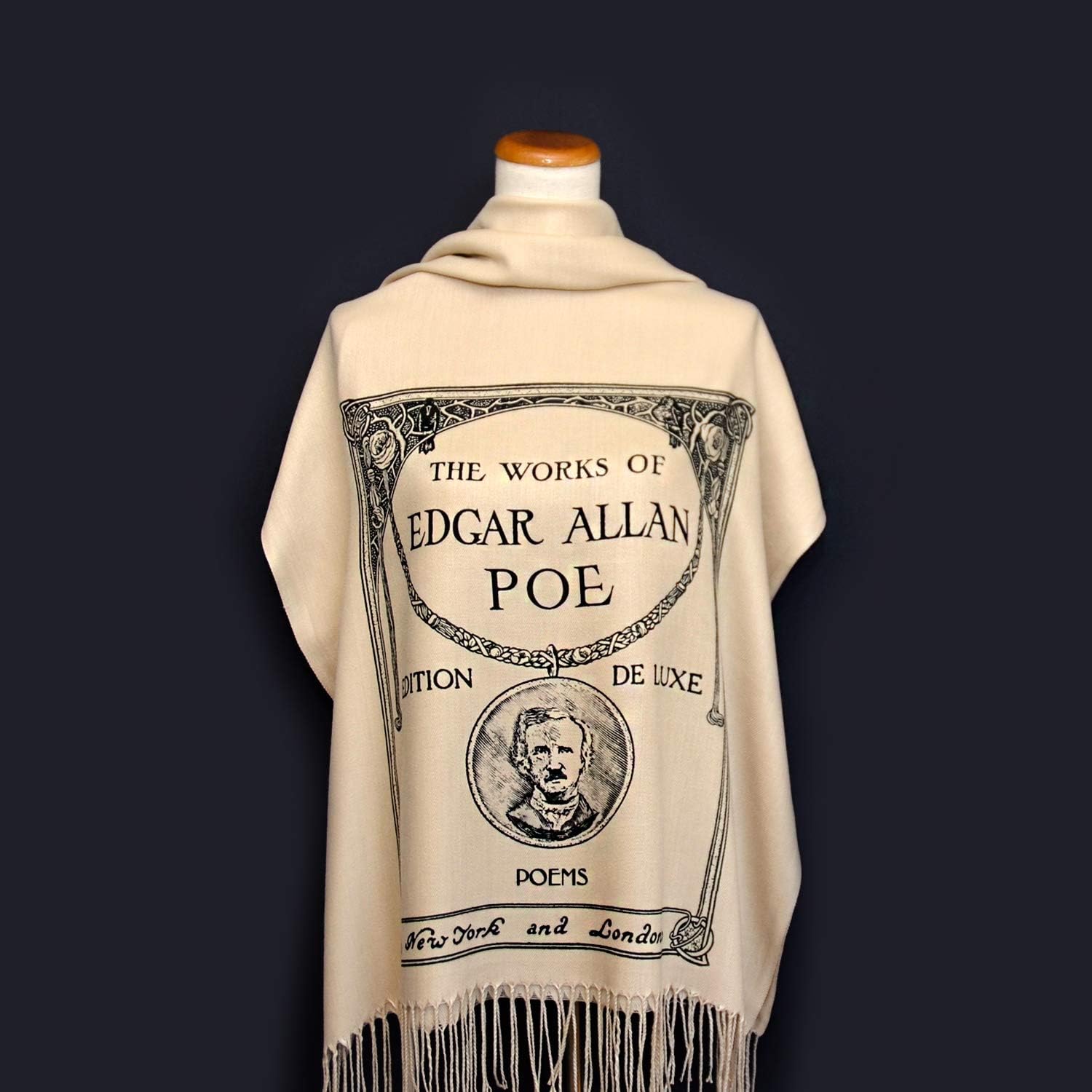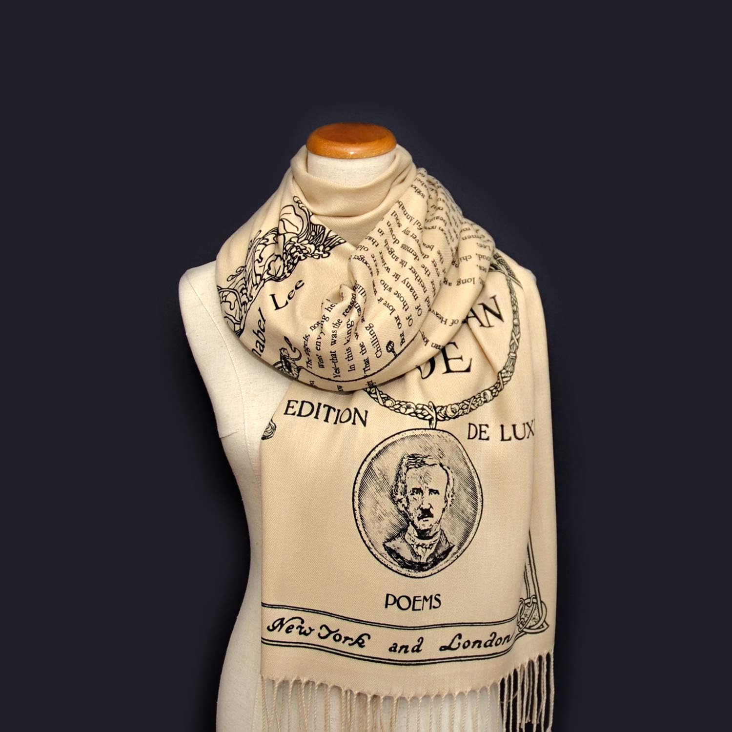 Beautiful "Annabel Lee" by Edgar Allan Poe Shawl Scarf Wrap This scarf is very soft and cozy. You will love this scarf ! "Annabel Lee" is the last complete poem composed by American author Edgar Allan Poe. Written in 1849, it was not published until shortly after Poe's death that same year. Title page and full text of the poem printed on soft , beige colored viscose shawl with linen texture. Perfect gift for a book lovers ! Scarf size: Length: 72 inches Width: 26 inches Print size: 16" x 20" at both ends ( title page at one end and full poem text on the other )