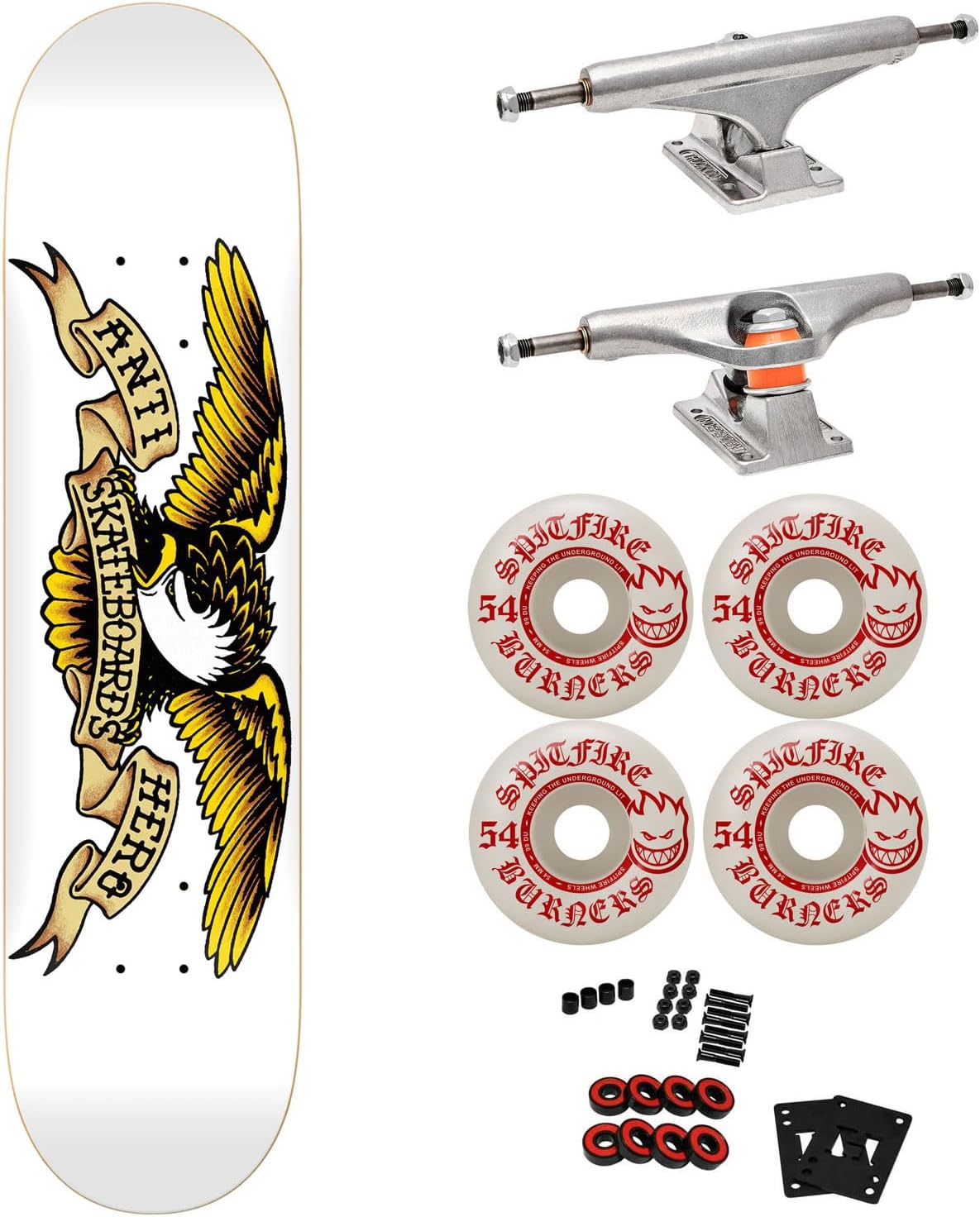 Includes hand selected components to make a premium complete that even the pros would be proud of. Top tier parts from leaders in the industry. Includes an Anti Hero Deck, Independent Trucks, Spitfire Wheels, Abec 5 Bearings, Black Diamond Griptape, 1" Hardware and Risers.DECK: Premium 7-Ply North American Maple.TRUCKS: Independent MiD. Superior in the streets. Lower profile 52mm tall hanger for optimal contact point angle on your nose and tail for all-around street skating. The innovative new Shaft Nut in the baseplate creates a rigid and durable solution to lateral movement found in most inverted kingpin designs and increases adjustability.WHEELS: The newly developed burners offer a new tier in Spitfires line. Using a unique new urethane, the burners provide an option for any skater looking for a high-quality wheel that’s great to ride and doesn’t sacrifice performance for the price. Poured in the Bighead shape, 99A durometer hardness. 54mm x 34.5mm.THE REST: Abec 5 Bearings, 1" Hardware, 1/8" Riser Pads, Black Diamond Griptape. Includes everything you need to customize and set up this complete.