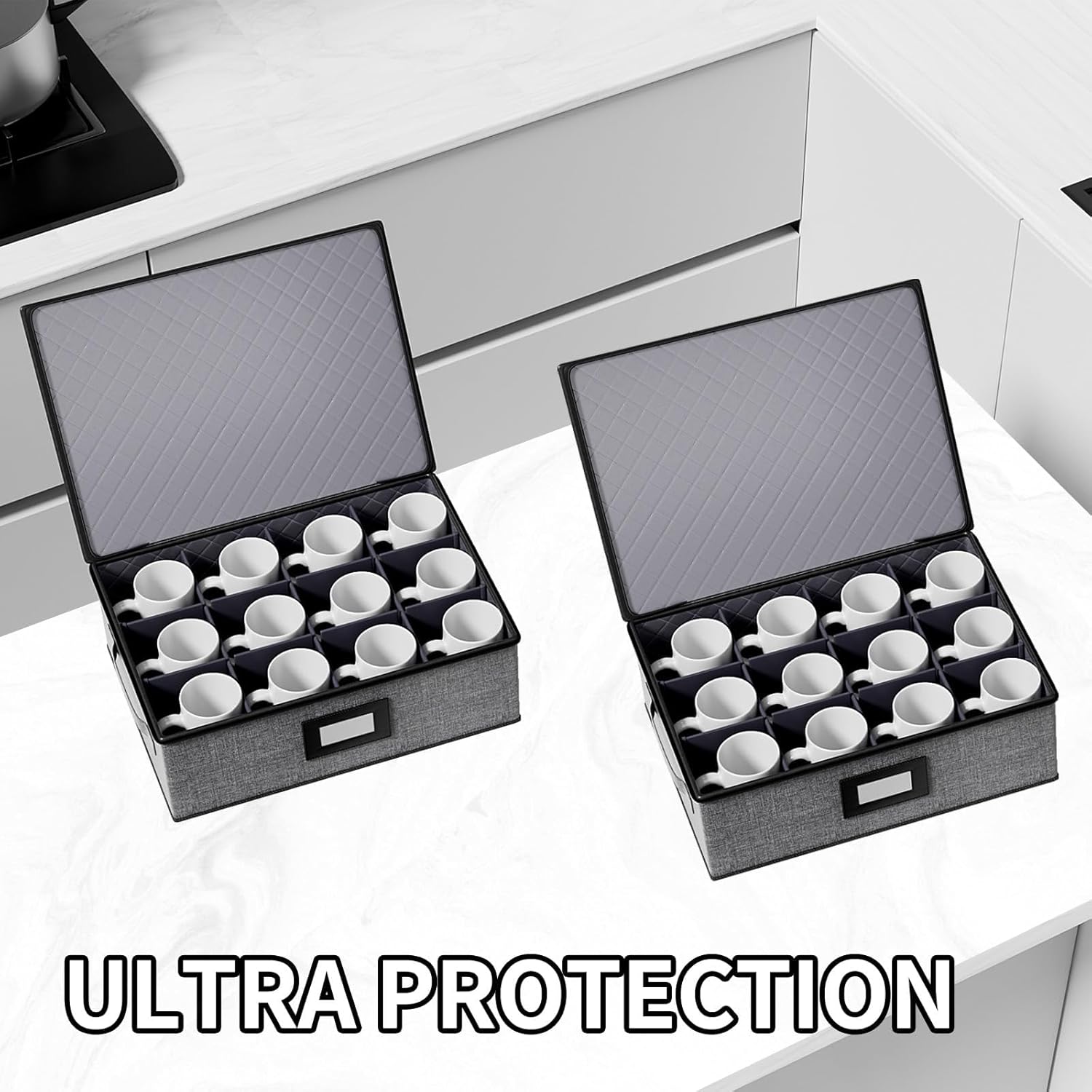 Aokeyee 2-Pack Cup & Mug Storage Box with Dividers, Hard Shell Organizer with Lid, Handles, Zippers & Label Slot, Holds 24 Mugs, Teacups & Glasses, Stackable Containerfor Moving & Protection, Grey
