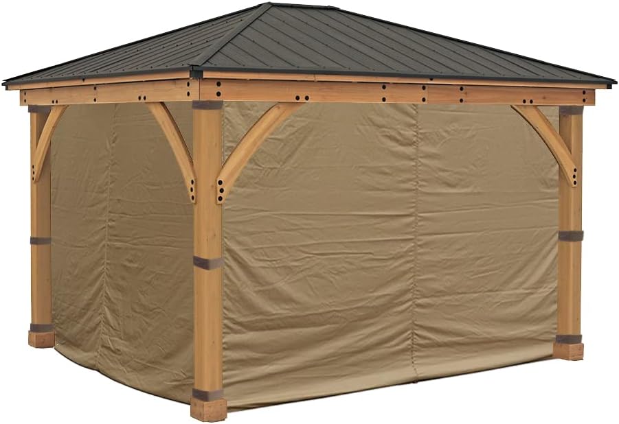- Can ONLY fit with 11 ft. x 13 ft. Yardistry Meridian Gazebo. Gazebo originally sold at Home Depot. Model# YM11912 - MUST PAIR WITH your exsiting MOSQUITO MESH RAIL SYSTEM (Model# YM11796) AND the Yardistry 11 ft. x 13 ft. Meridian Gazebo - provide more privacy room and protection from sun and winds - HIGH STANDARD TESTED MATERIAL: CPAI-84 US Standard fire-retardant, UV-protected, Water-Repellent (not water resistance), 100% polyester fabric. - Four wall enclosures. Zippers in center of each side allows for easy entry and exit. . - Heavy Duty Metal Grommet Top. Including hanging hooks. - Privacy curtains only. NOT INCLUDING a gazebo frame, mosquito mesh nor rail system. - Note: Not all gazebos are designed with netting or curtains. Before placing your order, please ENSURE you have the MOSQUITO MESH RAIL SYSTEM (MODEL #YM11796) AND the 11' x 13' Yardistry Meridian Gazebo (YM11912). This curtain is designed to hang on the tracks of your existing MOSQUITO MESH RAIL SYSTEM (Model# YM11796).