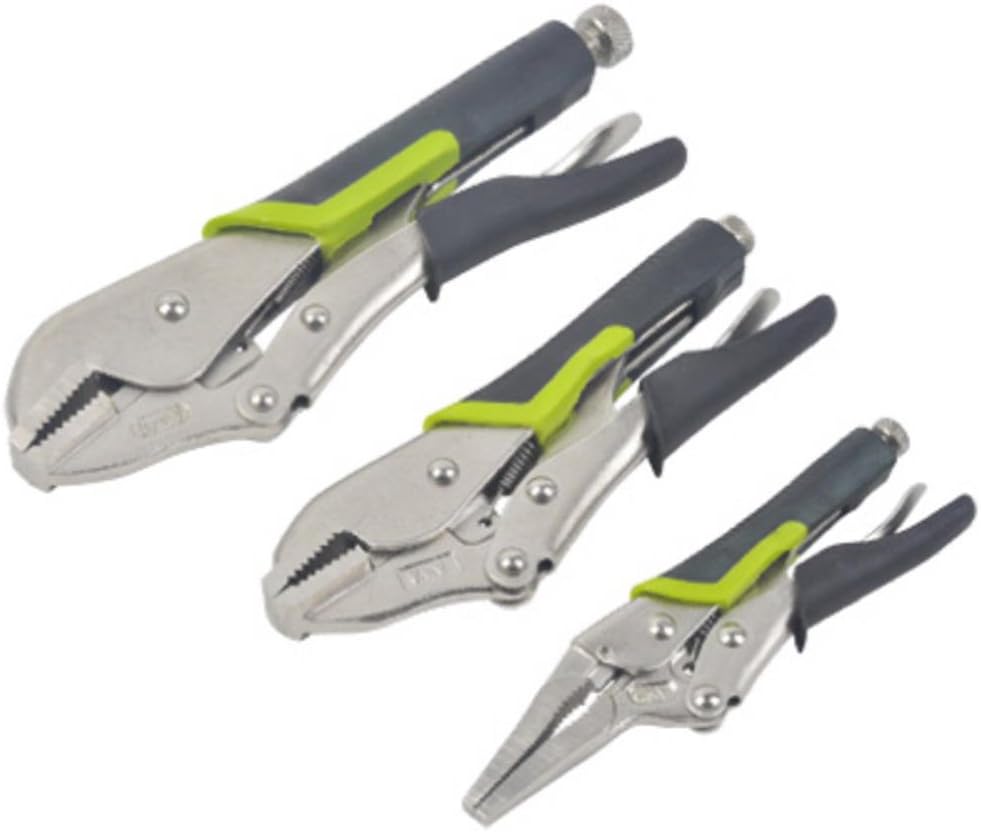 The Master mechanic 3 piece locking plier set includes: 7" & 10" straight jaw locking pliers and 6" long nose locking pliers with a 3-rivet design for flexibility and better results. Made of high-grade, heat-treated alloy steel, each locking plier comes with dual molded grip handles for comfort while you use and a knurled adjustment knob for Quick adjustments. Pliers meets or exceeds all ANSI standards. Great for home improvement and technical fixes.