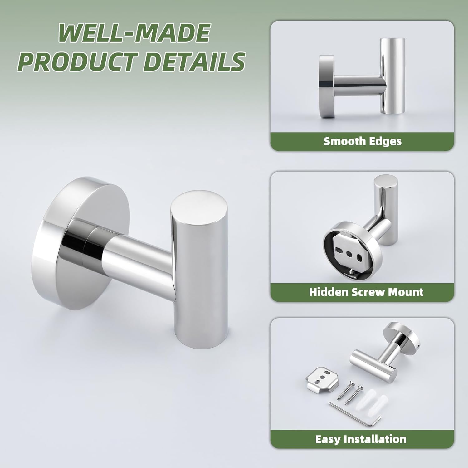 Installation Method: Wall MountedToilet Paper HolderFinish: Polished ChromeMaterial: 304 Stainless SteelDimensions: 7.87" x 2.76" x 5.91"(20 x 7 x 15 cm)Net Weight: 0.32 lb. (147 g)Towel Hook for BathroomFinish: Polished ChromeMaterial: 304 Stainless SteelDimensions: 1.89" x 2.56" x 2.24"(4.8 x 6.5 x 5.7 cm)Net Weight: 0.21 lb (96 g)Round Towel RingFinish: ChromeMaterial: Solid Stainless SteelDimensions: 7.09" x 2.76" x 7.87" (18 x 7 x 20 cm)Net Weight: 0.36 lb.(162 g)CARE AND MAINTENANCE1.ONLY clean with a soft, damp cloth gently.2.DO NOT USE detergents as they may harm the protective finish of your bath accessories.3.Maintenance period is 1-2 months, this care will maintain the metallic gloss finish.WARM PROMPT1.NOTE: All photography props are NOT included in the package.2.Manual measure may occurs a little dimension deviation, please in kind prevail.3.Due to light influence and display resolution, pictures and objects may have slightly color aberration.