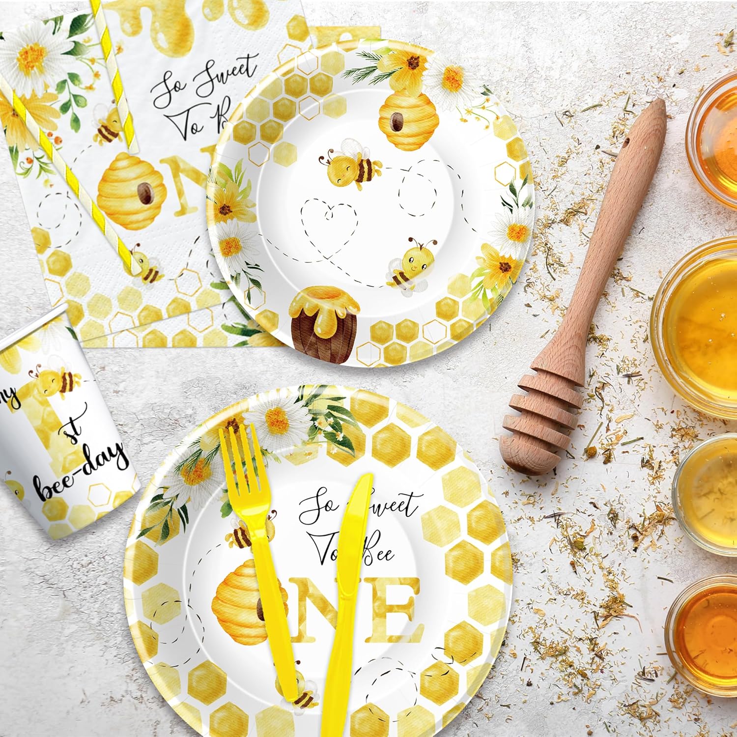 First Bee Day Birthday Plates and Napkins Party Decorations Dinnerware Includes: 24 Pcs x 9'' Bee Party Plates 24 Pcs x 7'' Bee Paper Platess 24 Pcs x First Bee Day Napkins 24 Pcs x Disposable Forks 1 Pcs x Bee 1st Birthday Table Cover HAPPY BIRTHDAY! These bee theme 1st birthday party decorations tableware set will be welcomed by all party participants, get these party supplies ready for a fun party with family and friends!