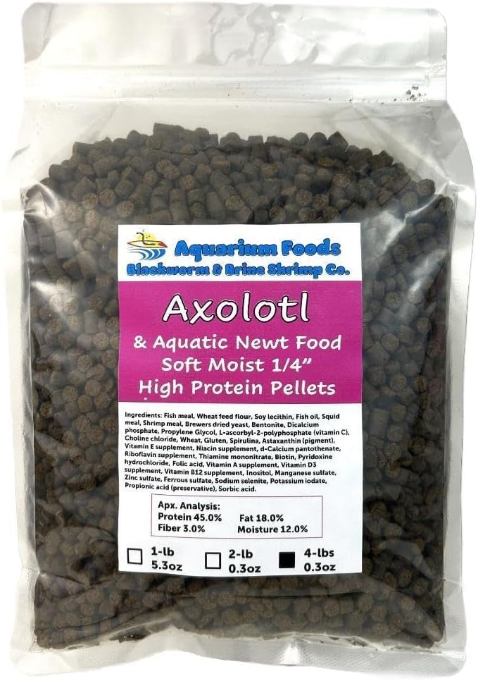 Aquatic Foods & Blackworm Co. Axolotl 1/4" Soft Moist Sinking PelletsIdeal for Axolotls, Aquatic Newts, Shrimp, Snails and all Tropical FishFeeding Instruction:Lightly feed 2-3 times a day, feed only what your fish can consume within a few minutes. Remove any remaining food after 10 minutes to avoid polluting the water.Ingredients:Fish meal, Wheat feed flour, Soy lecithin, Fish oil, Squid meal, Shrimp meal, Brewers dried yeast, Bentonite, Dicalcium phosphate, Propylene Glycol, L-ascorbyl-2-polyphosphate (vitamin C), Choline chloride, Wheat, Gluten, Spirulina, Astaxanthin (pigment), Vitamin E supplement, Niacin supplement, d-Calcium pantothenate, Riboflavin supplement, Thiamine mononitrate, Biotin, Pyridoxine hydrochloride, Folic acid, Vitamin A supplement, Vitamin D3 supplement, Vitamin B12 supplement, Inositol,Manganese sulfate, Zinc sulfate, Ferrous sulfate, Sodium selenite, Potassium iodate, Propionic acid (preservative), Sorbic acid.Apx Analysis:Crude Protein 45.0%Crude Fat 18.0%Crude Fiber 3.0%Moisture 12.0%