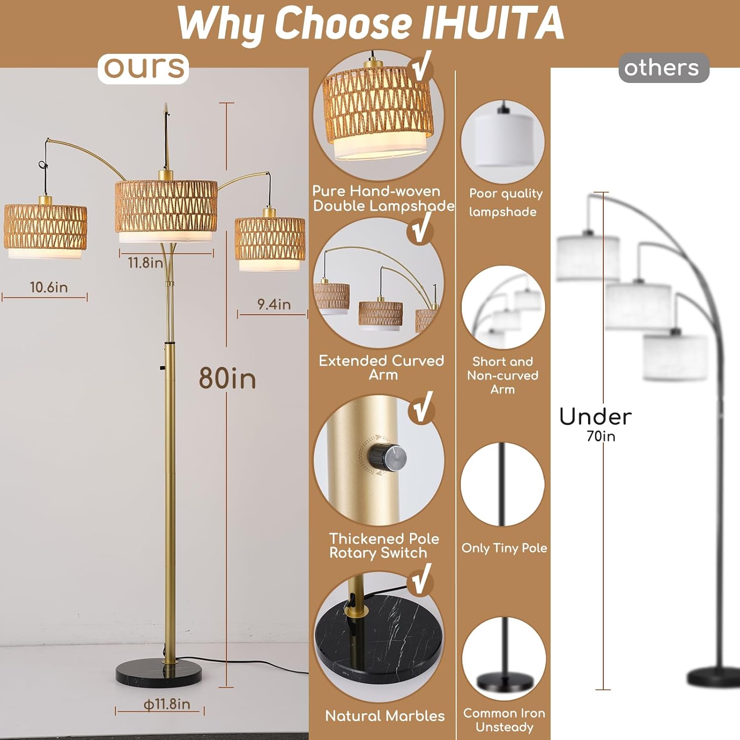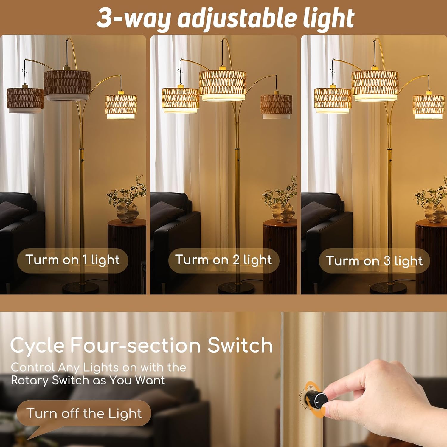 | Additional Features | 3-Way/ Rotary switch/Adjustable Arms/Marble Base /Swiveling Rattan Shades |