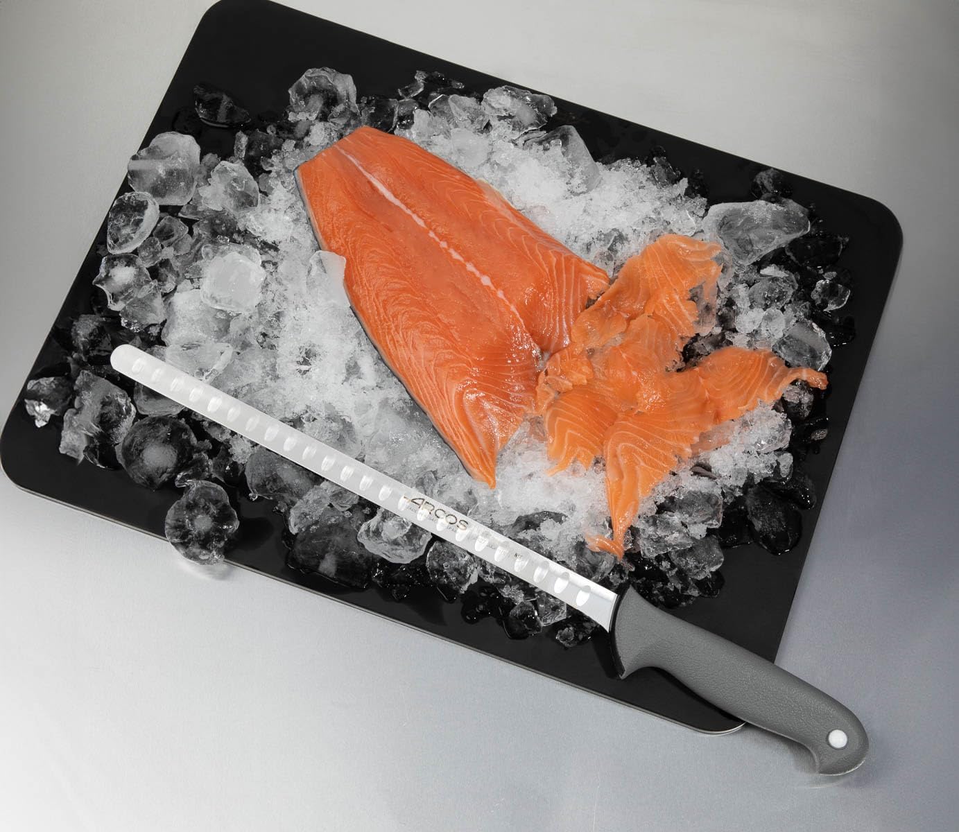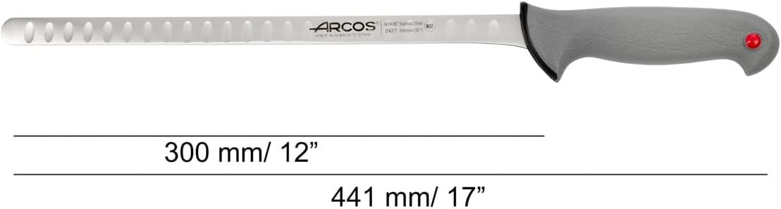 Introducing the Arcos Series Colour Proof Salmon Knife Fish Knife, the perfect tool for professional chefs and home cooks alike who demand the best in performance, comfort, and hygiene. With its exclusive NITRUM stainless steel blade and revolutionary ergonomic handle design, this knife delivers superior cutting power, comfort, and adaptability that will take your culinary skills to the next level. The Colour Proof series is specifically designed for prolonged and heavy professional use, making it the ideal choice for chefs who demand the best in quality and durability. The high usable and lasting NITRUM stainless steel blade is specially treated to provide superior sharpness and resistance to corrosion, ensuring that your knife will stay sharp and ready to use for years to come. The handle used in this series is a revolutionary ergonomic design that features a core of polypropylene (PP) in the heart of the handle and a soft rubber coating on the outside. This special mixture of materials gives this unit greater comfort and adaptability, as well as being non-hygroscopic (meaning it does not absorb liquids). It is also resistant to high temperatures and slippage, ensuring that you can use this knife with confidence and ease. One of the unique features of this knife is its colour identification system, which allows each knife to be identified for cutting a specific food using a system of coloured polypropylene indicators located on the handle. This system promotes better hygiene and health for the consumer, based on European standards. The Arcos Series Colour Proof Salmon Knife Fish Knife is 12" long and has a blade made of NITRUM stainless steel, making it the perfect tool for filleting and preparing salmon and other types of fish. With its comfortable and ergonomic handle, superior cutting power, and innovative colour identification system, this knife is a must-have for any professional chef or home cook who demands the best in quality, performance, and hygiene. So why wait? Order your Arcos Series Colour Proof Salmon Knife Fish Knife today and experience the ultimate in cutting power, comfort, and hygiene!