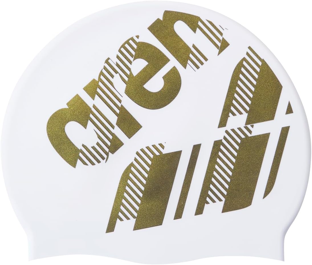 Silicone cap with large printed Arena logo on the side Metallic print creates a glossy statement. The stretchy silicone material also fits your head and keeps water out and reduces damage caused by pool water. Recommended for swimmers who train hard or want to swim loosely.