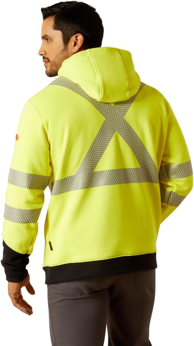 The flame-resistant Ariat® Hi-Vis Hoodie is all about keeping you protected and seen on the jobsite. Built from their soft, durable, water-repellent stretch-fleece, it has highly reflective tape that is segmented so it breathes and moves with you while you work.
