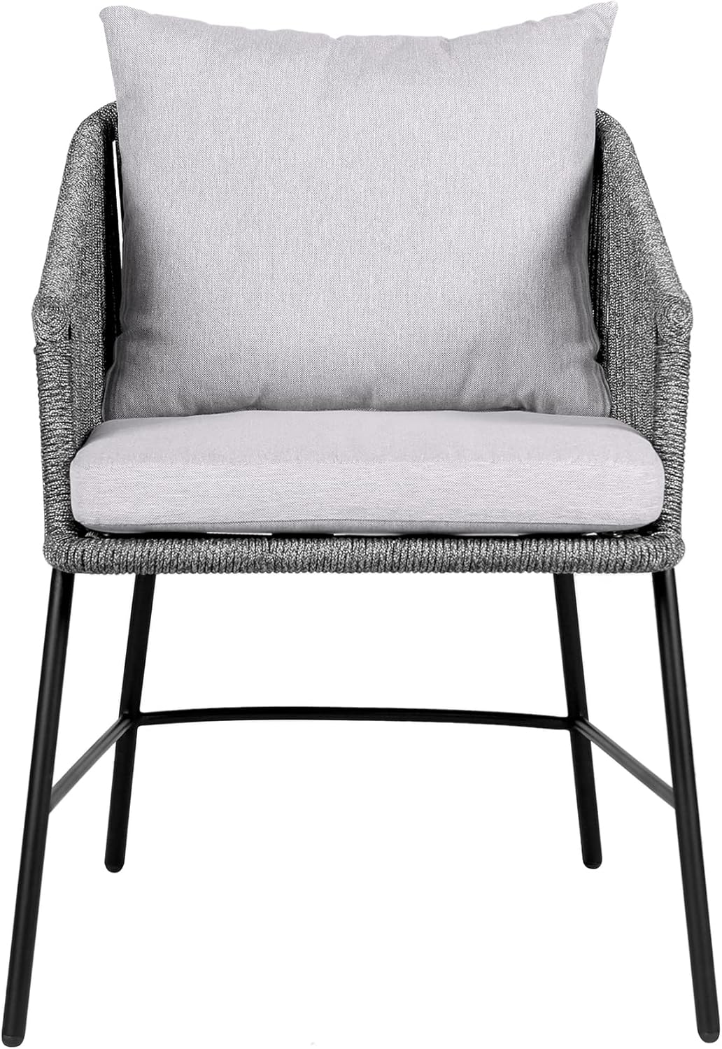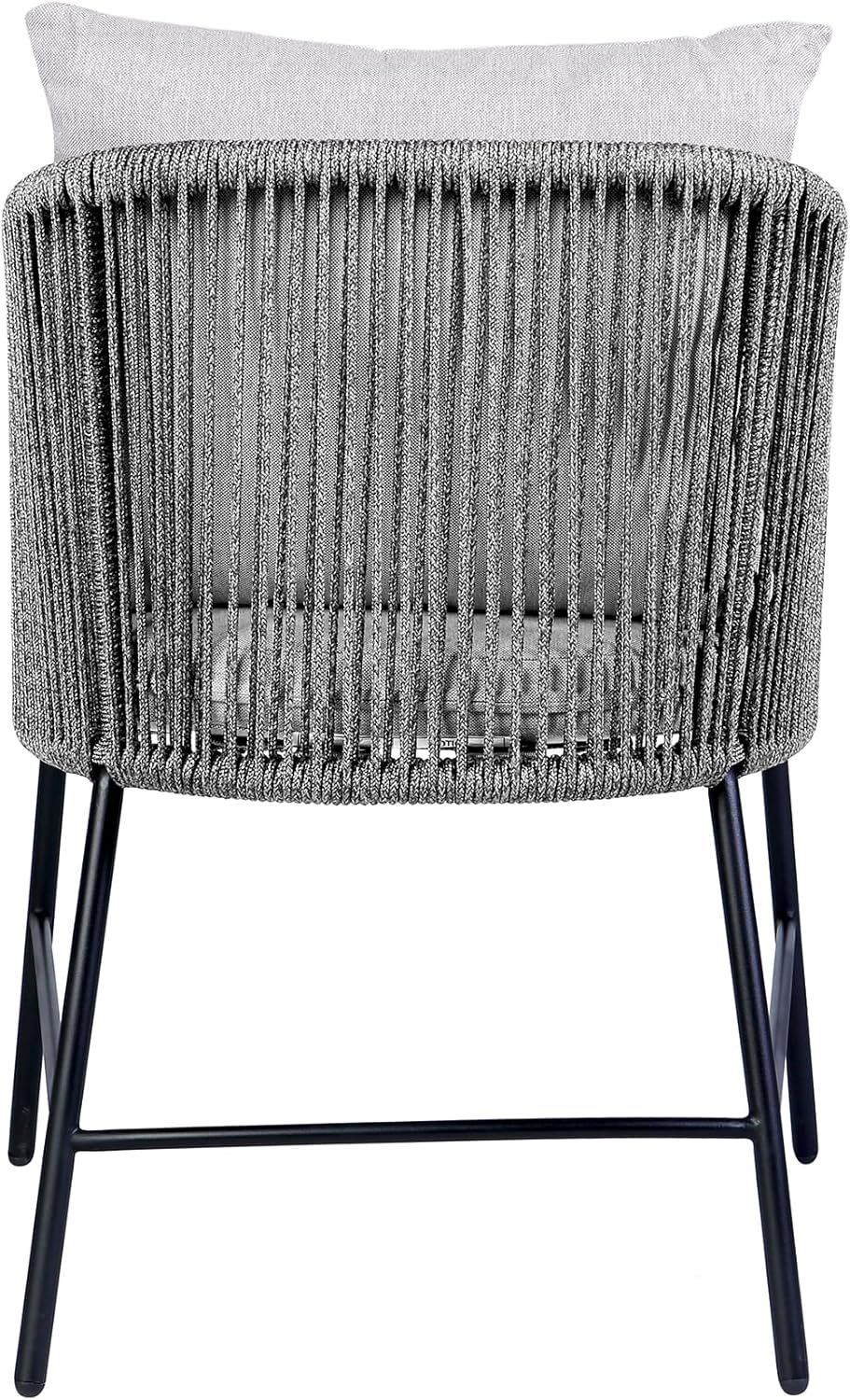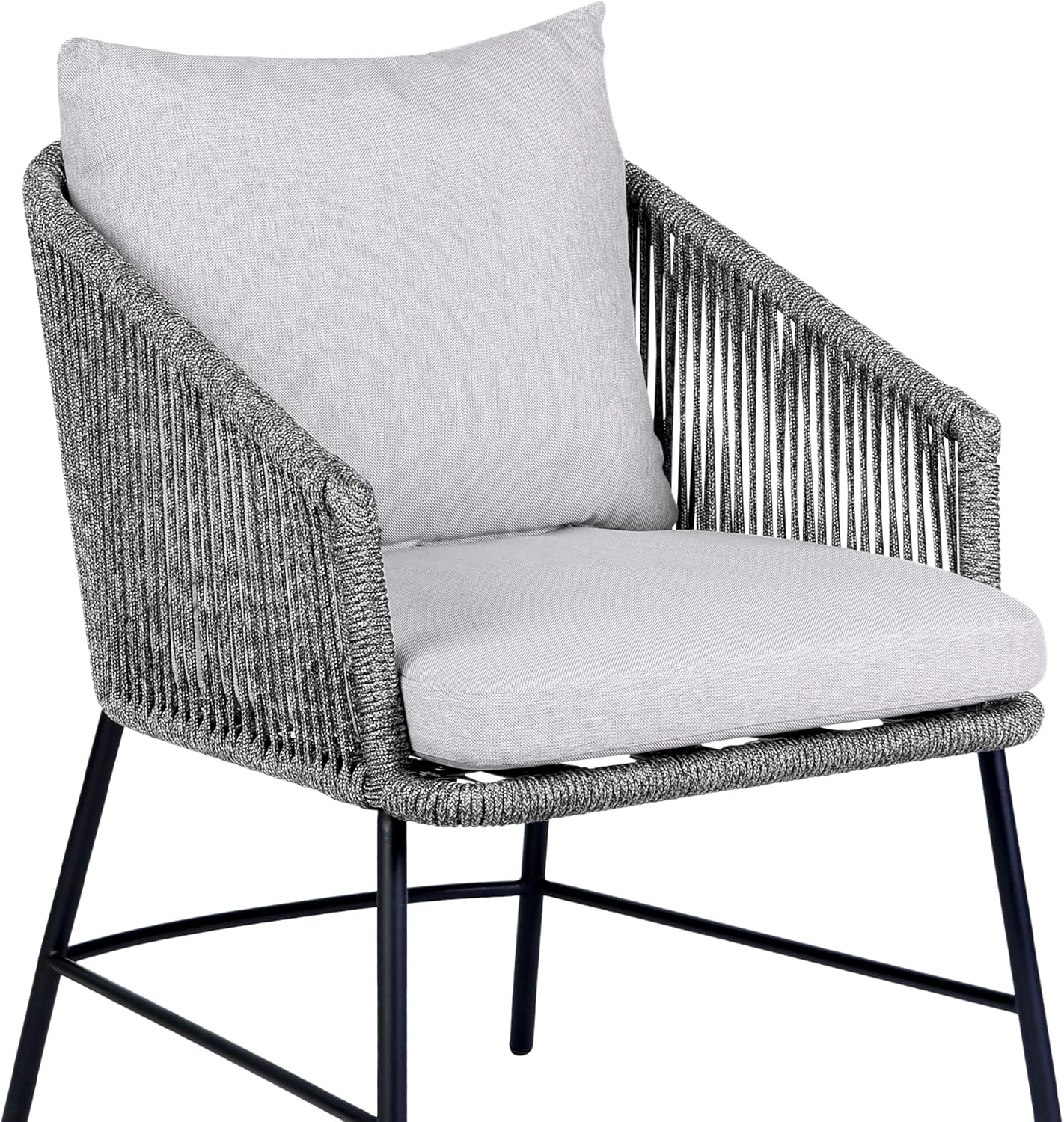 Dine outdoors in style with our Calica patio dining chair. The curved and sheltering back of the chair is upgraded with an elegant weave. Crafted with resilient and weather resistant grey rope, the weave greatly accentuates the visual and tactile feel of our outdoor armchair. This patio chair sits upon slender black steel legs to serve as a sleek and stylish addition. Steel does not dent or get bent out of shape as easily as some aluminum furnishings can. Lighter than wrought iron but heavier than aluminum, steel provides strength, stability, and endurance in extreme temperatures. Featuring a comfy cushion and a boxy seat, our outdoor dining chair effortlessly combines style and comfort, while the zipper closure allows you to remove the cushion covers for easy cleaning! Moisture and water are ongoing concerns for outdoor furniture. Even if your outdoor furniture stays out of the rain, condensation is likely going to build up on the furniture regularly. Polyester is not permeated easily by water. This means the patio furniture will have a longer life with polyester upholstery. Looking fresh in all seasons, our durable outdoor dining chair remains the perfect complement to your patio, backyard, or balcony. This patio chair conveniently ships fully assembled and can be used right after unpackaging. The Calica outdoor dining chair features a grey rope weave, durable black steel legs, and grey upholstery on the cushions.