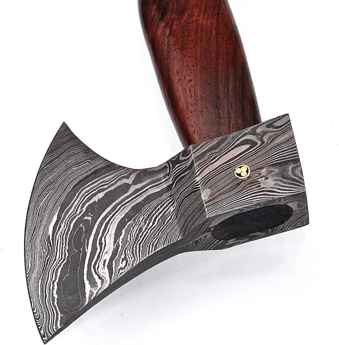 Looking for an axe that can withstand the test of time? Well look no further. This functional handmade axe is constructed from excellent quality materials and is made to be used. The head of the axe is made from folding 1095/15N20 steels over and over approximately 350-360 times to create the gorgeous rippling affect you see here. The large crescent-shaped blade edge provides a larger cutting edge, and the slight slope of the blade allows downward strikes. The back of the axe head is flattened to serve as a hammer tool. A pure brass mosaic pin placed in the center of the eye creates a sturdier hold as well as a special touch. The handle is made from sheesham wood that had been smoothed, contoured, and covered with a sleek protective coating. A lanyard hole is provided to attach rope or cord. Included with this beauty is hand tooled genuine leather sheath that has been stained a rich dark brown and features three snap closures and a belt loop for easy secure carry. *Please note that due to the sheath being constructed from new leather, additional stretching may be required for a perfect fit. Features: Blade Material: Damascus Steel, Steel: 1095/15N20, Layers: 350-358, HRC: 58-60, Pure Brass Mosaic Inlay, Handle Material: Sheesham Heartwood, Hand Tooled 100% Genuine Leather Sheath Included, Specifications: Overall Length: 16.5 inches, Overall Width: 5.25 inches, Blade Length: 4 inches, Thickness (Eye): 24.50 mm, Thickness (Edge): 1.5 inches, Handle Length: 14.25 inches, Handle Thickness (At Thickest Point): 27.3 inches