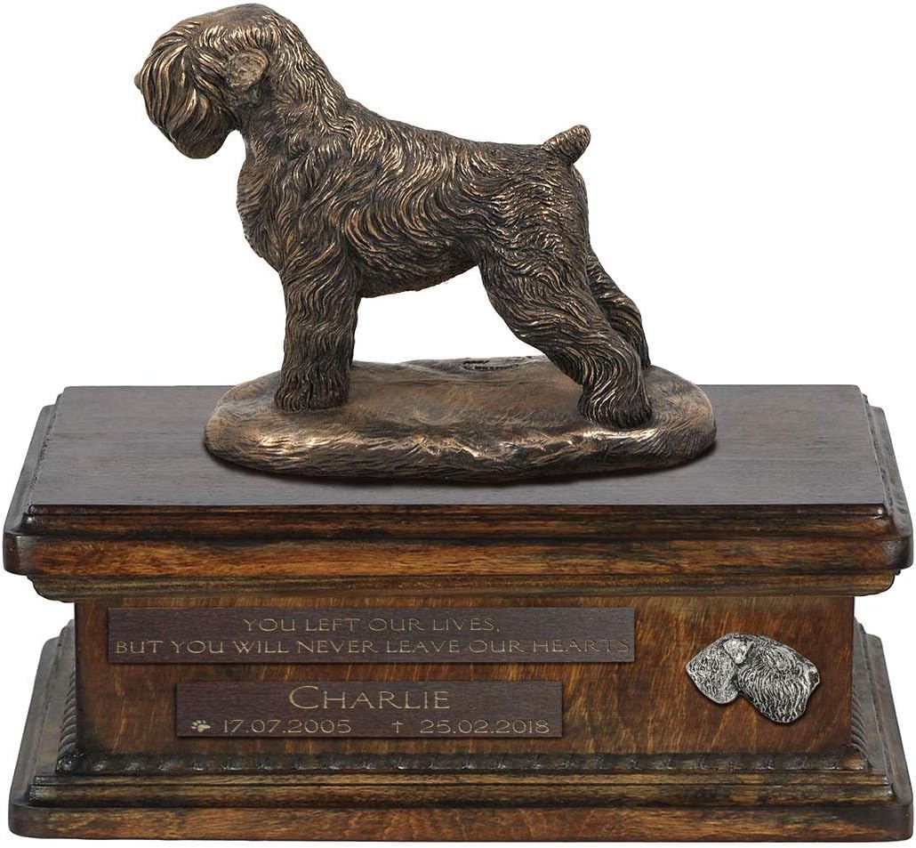 Handmade with precision and care, this cremation box combines artistry with functionality to create a unique and lasting tribute. The Cold Cast Bronze Dog statue, intricately detailed, becomes a focal point of this urn, capturing the spirit and essence of your furry companion. Crafted from durable birch wood, the urn makes for a secure and enduring final resting place. The wooden material adds a touch of warmth and natural beauty, making it a fitting tribute to your pet's memory. Customization is at the core of our Art-Dog Collection, offering a diverse range of statues representing any breed. This allows you to create a personalized memorial that truly reflects the unique qualities of your beloved pet. The wreath-shaped decorations further enhance the urn's aesthetic appeal, adding a subtle yet elegant charm to the overall design. Practicality meets style with the convenient removable lid, ensuring an easy and respectful process for placing your pet's ashes. The urn's dimensions, measuring 21 x 29 x 11 cm, strike a balance between ample space for ashes and a compact size that fits seamlessly into your home. More than just a container, this exclusive Dog Urn by Art-Dog is a meaningful work of art, radiating style and elegance. It stands as a testament to the enduring love and companionship you shared with your pet, creating a memorial that will forever honor their memory.