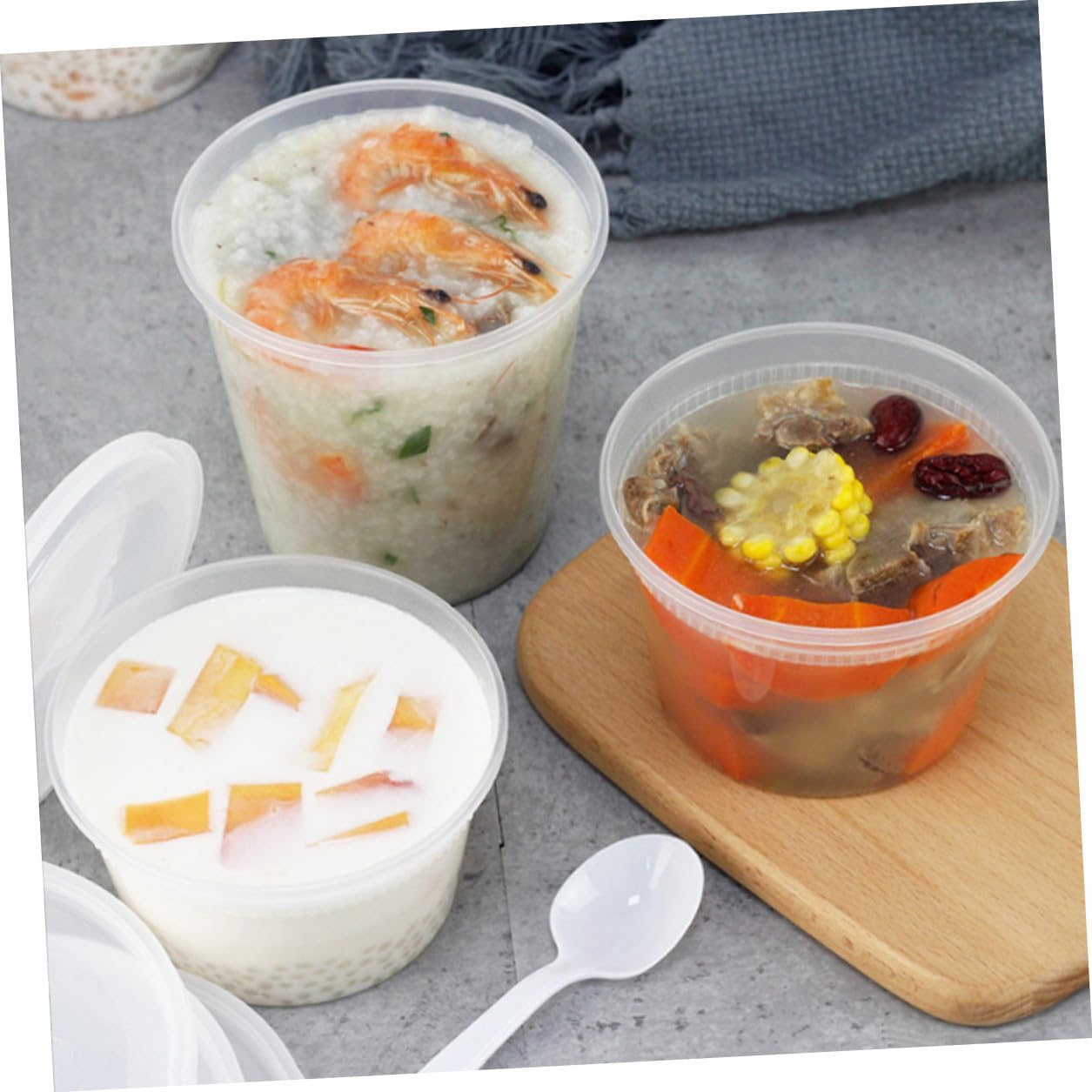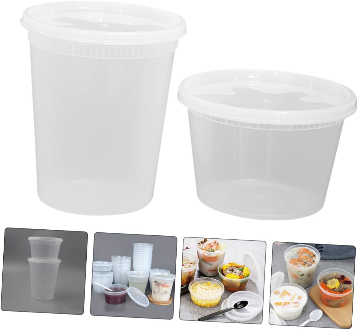 Package List 25 x Disposable Soup Cups (32oz) 25 x Disposable Soup Cups (16oz) Characteristics -Size:14.22X11.68X11.68cm/5.59X4.59X4.59in (32oz) -Product Info:Temperature-resistant packing bowl -Size:11.68X11.68X7.62cm/4.59X4.59X2.99in (16oz) -Material:PP -Color:White - The leakproof, waterproof and oil proof cups can be used as porridge cups, dessert cups, ice cream cups and more soup containers. - The surface of the cups is smooth, no burrs, non-skid, the proper size makes you easy to carry. - A bowl with a lid is perfect for putting in some eggs, hot or cold cereal, hot soups, flour soup cups. - The takeout cups are suitable for many occasions, such as home, dessert shop, party, buffet and more hot soup containers with lids. - Owning the strong wear and break resistance ability, very practical, with excellent texture soup bowl with lid.Goods Descriptionsoup cups Besides, the product is stylish and elegant.Porridge Soup Holder Our takeout soup container is with modern design, the portable mousse cup is suitable for your favorite dessert like chocolate mousses, cake, ice cream, soup, porridge, etc