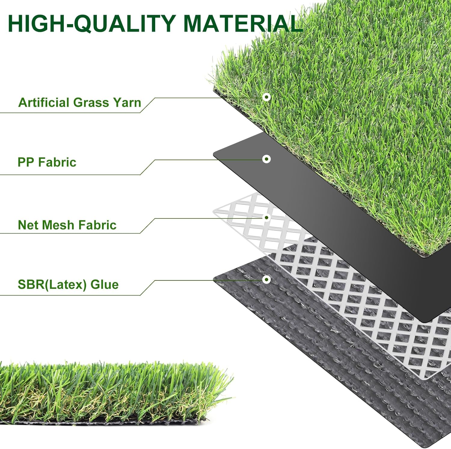 • Realistic 4-Tone Artificial Grass: This artificial grass rug features a premium 4-tone grass color with a mix of straight and curled blades, closely mimicking real turf grass. The 1.38-inch pile height creates a lush, natural appearance that enhances any outdoor decor, patio, balcony, or garden space.