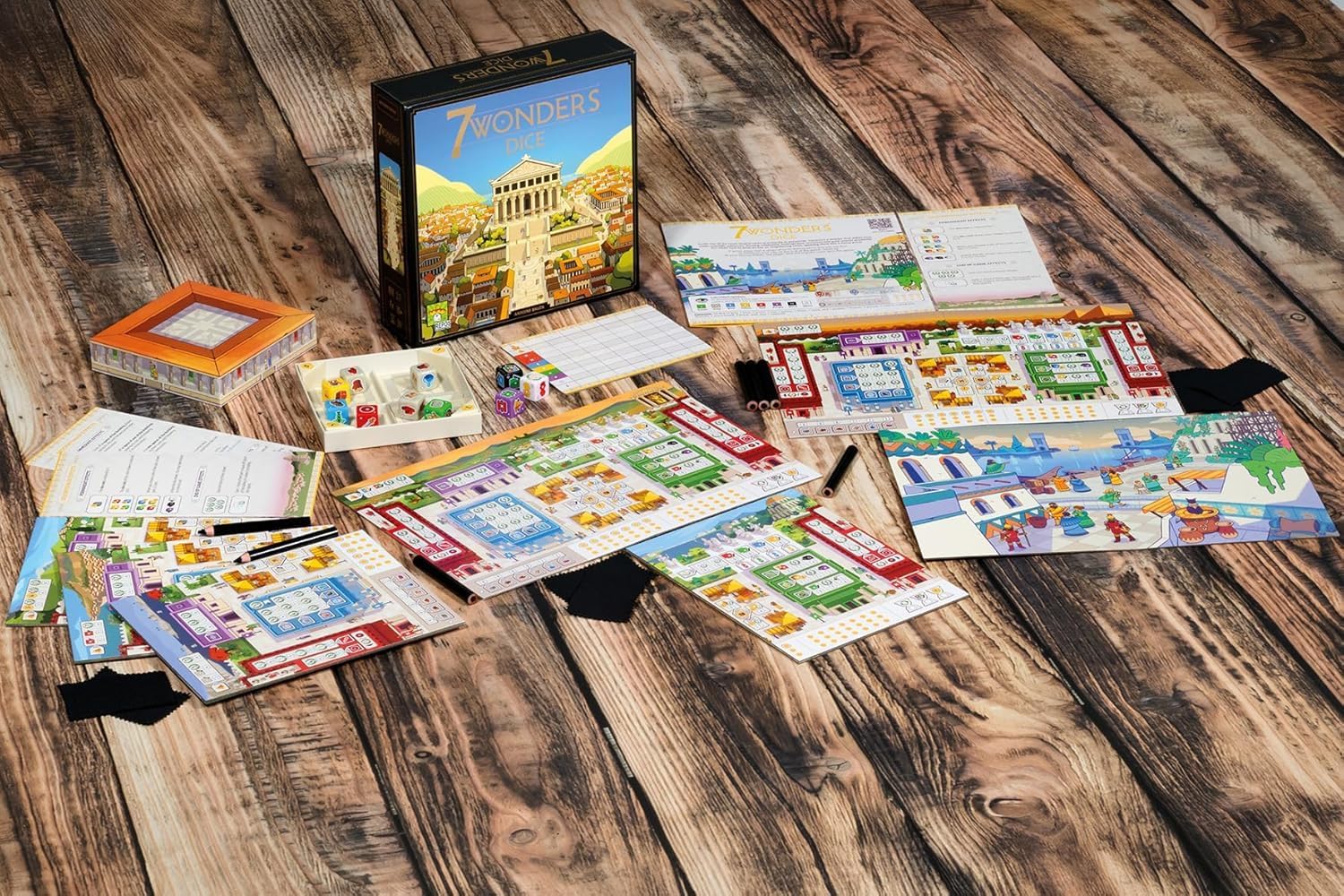Product Description: Lead to wealth and glory one of the seven largest cities of antiquity. Build a world wonder that lasts for millennia, make quantum leaps in science, grow your economy, manage your raw materials and gold reserves wisely, but always keep an eye on your neighboring cities: ignoring them can cost you a dear! 7 Wonders Dice is the dynamic dice game variant of the famous connoisseurs game 7 Wonders. Instead of cards, you use dice to strategically develop your old metropolis. With each turn, you simultaneously pick dice from the central forum and use their symbols to build buildings in your city, collect resources, build military power or make scientific progress. You should always keep an eye on your neighboring cities, as their evolution influences your decisions – and military conflicts are pre-programmed. With seven individual gaming tables and different ways to make victory points, no game looks like the other. Whoever completes his wonder of the world, tactically builds the right buildings and intelligently handles raw materials and gold guarantees the most victory points – and thus victory. Package includes: Game Instructions: 1 10 x Dice Table: 7. Pencils: 7 Cloths: 7 Dice Box (forum): 1 Evaluation table: 1. Play aid: 3