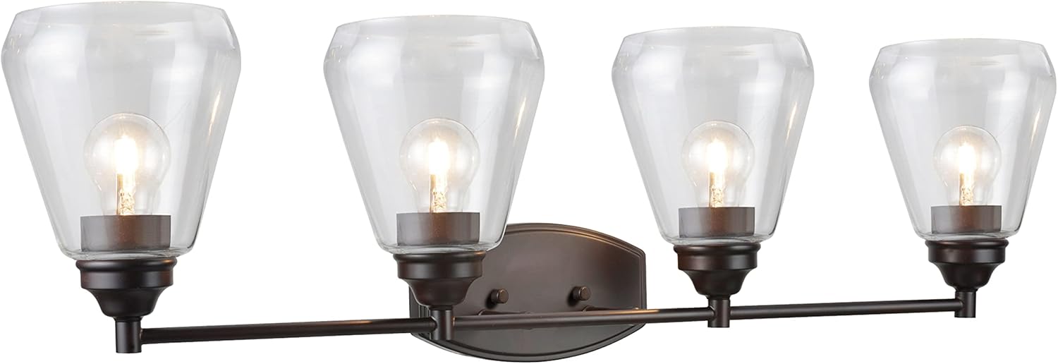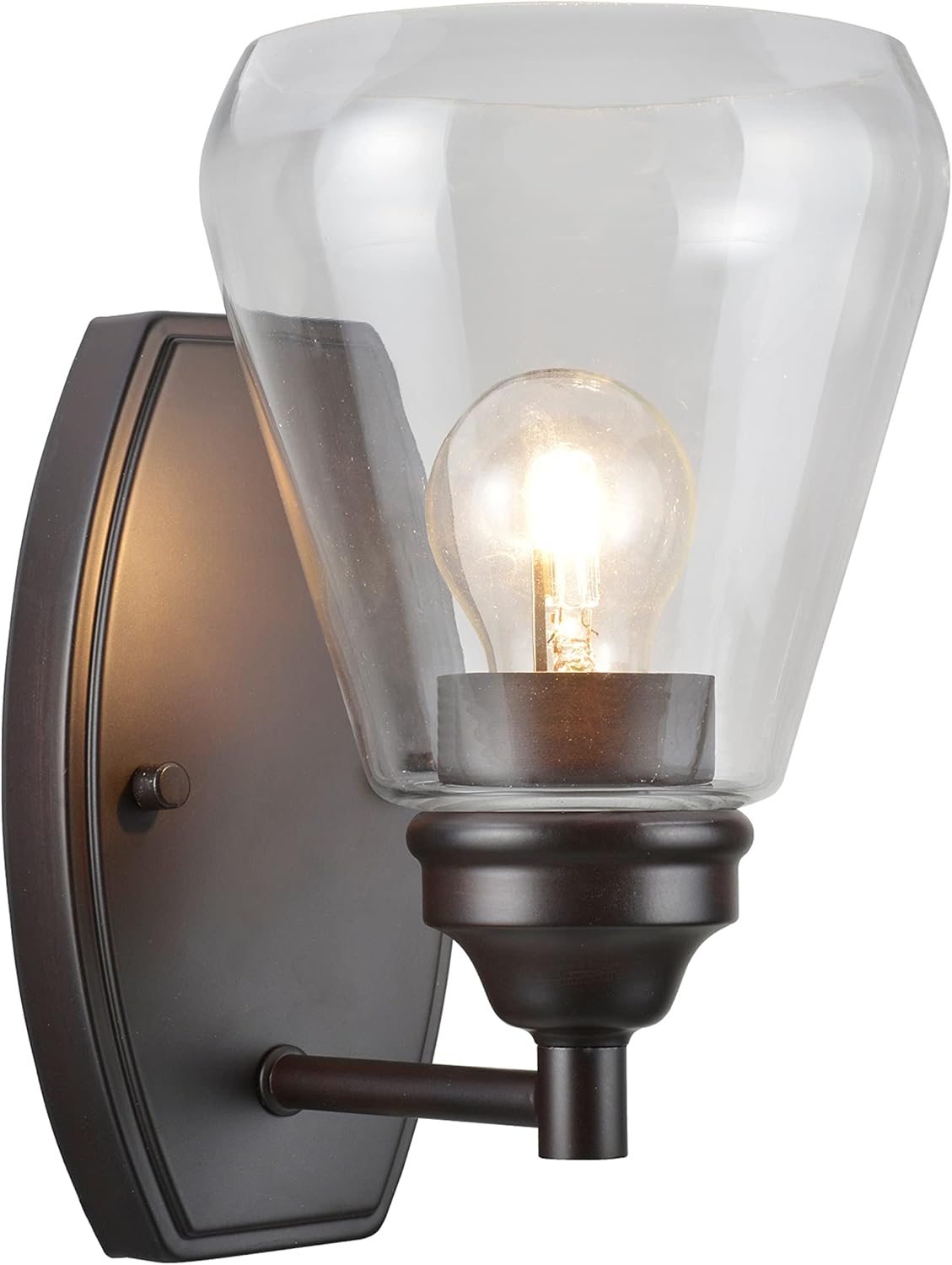 Aspen Creative is dedicated to offering a wide assortment of attractive and well-priced portable lamps, kitchen pendants, vanity wall fixtures, outdoor lighting fixtures, lamp shades, and lamp accessories. We have in-house designers that follow current trends and develop cool new products to meet those trends. Aspen Creative offers a transitional designed 1 light bathroom vanity wall light fixture in oil rubbed bronze finish. It includes a clear glass shade. Fixture dimensions: 7 3/4 inch deep x 6 inch wide x 9 3/4 inch height. Uses 1 (E26) medium base light bulb, 60 watt Max (not included). fixture is dimmable with standard wall dimmer (not included). UL listed for bathroom wall installation above the mirror and vanity cabinet as well as powder rooms and make up rooms. It also can be installed as a wall sconce in living room, family rooms and hallways.