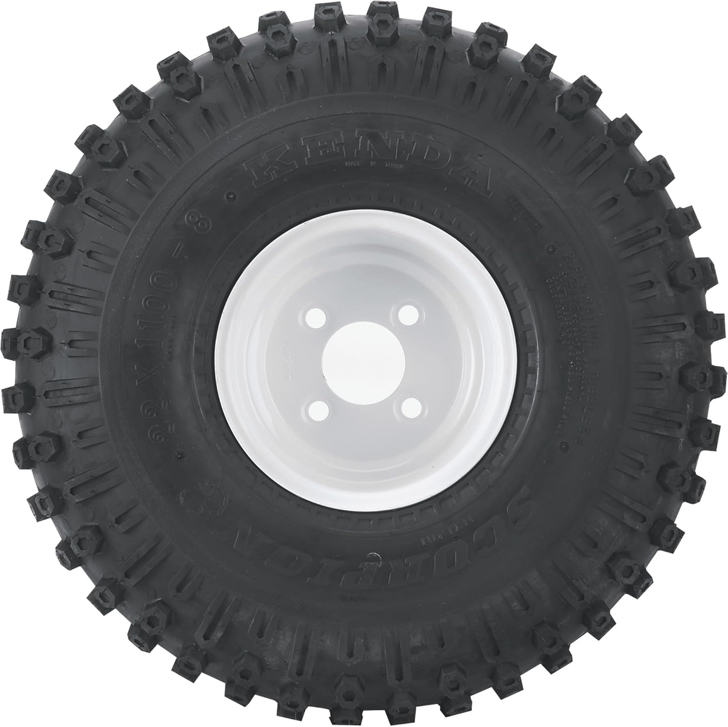 ATV utility and recreational wheel assembly. Low pressure, belted construction for greater puncture resistance. Built-in rim guards prevent dirt from wedging between tire and rim. Knobby tread. 4in. bolt circle, 4 bolt holes. Removable, 22 x 11 x 8. Tire Type: 2-ply, Outside Diameter (in.): 21.7, Tread Type: Dimple knobby, Load Capacity (lbs.): 340 @ 5 PSI, Rim Included: Yes, Tire Size (H x W x Rim Dia.): 22 x 11 x 8, Tire Size: 22 x 11.00-8, Rim Width (in.): 7, Tubeless Tire: Yes, Rim Diameter (in.): 8