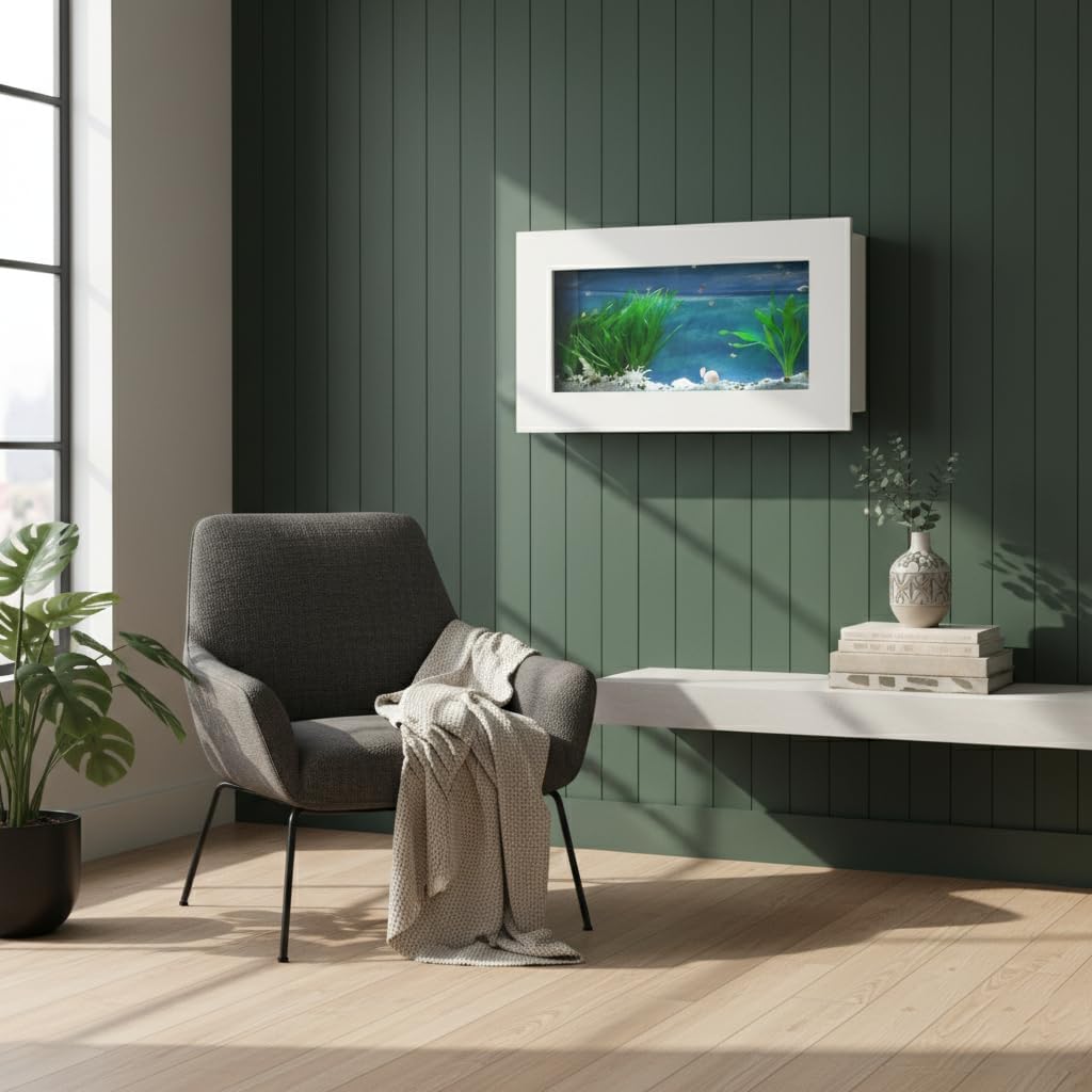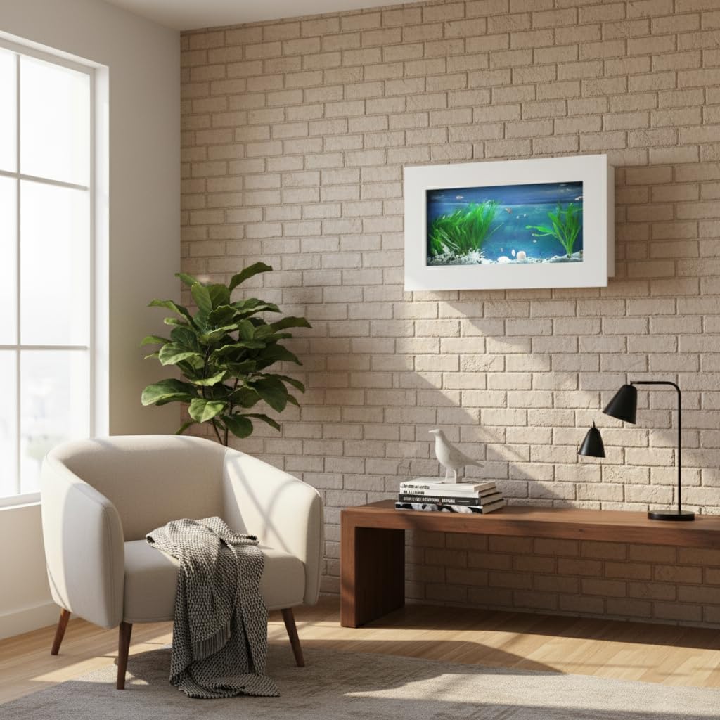 Transform Your Wall into a Stunning Aquatic Focal Point with Aussie Aquariums 3.0 Wall-Mounted Fish Tanks. Stop sacrificing valuable floor and counter space for a traditional tank. This sleek, modern wall-mounted aquarium is designed to look like a contemporary piece of art, blending the calming beauty of aquatic life with minimalist home décor. The striking design makes your fish tank a unique, conversation-starting feature in any room. Our one-of-a-kind wall-mounted aquariums are sure to please the senses. We take the beauty of an everyday aquarium and turn it into a work of art....literally. You can decorate your new aquarium with any ornaments, gravel, sea rocks, or shells that you like, as they are open at the top. Key Features & Benefits Space-Saving Design: Perfect for apartments, offices, small rooms, or hallways. It mounts directly to the wall, freeing up tabletop and floor space. Brushed Finish or Matte Painted Finish: The aluminum frame features a premium, brushed finish or painted matte finish that complements modern, industrial, and nautical-themed interiors. All-in-One Convenience: At only 4.5" deep, Aussie Aquariums create a spectacular world for a variety of marine life. All the basics of your dream aquarium are included. Includes the essential components you need to get started, such as a multi-stage filtration system, custom-fit lid, and energy-efficient LED lighting, along with the basics like a fish net, background paper, siphon cleaner, grabber tongs, and mounting brackets with toggle clips. Easy to Install & Maintain: We simplified the mounting to make it even easier to set up in under an hour. Offered in a variety of finishes. Comes with secure mounting hardware. The accessible design simplifies water changes and feeding. Requires minimal maintenance and is easy to clean. Model: Skyline Approximate Capacity: 5 Gallons Outer Frame Diameter: 35.4 in x 17.5 in x 4.5 in Material: High-quality Glass Tank with Brushed Aluminum Frame
