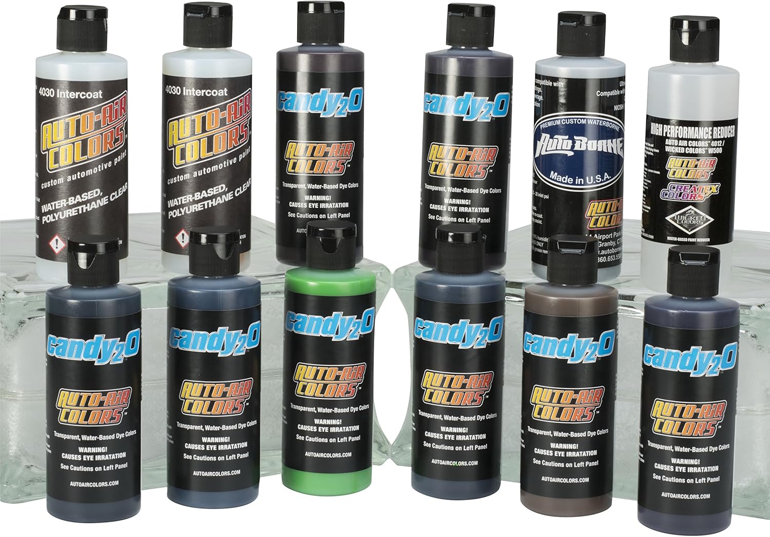 Candy2o Cool Box Set includes 4oz. Each: Lemon Yellow, Midnight Blue, Caribe Blue, Ultra Violet, Emerald Green, Dirt Track Brown, Red Oxide, Black, 4012 Reducer, 6013 Auto Borne Silver Sealer & 4012 Reducer (x2)