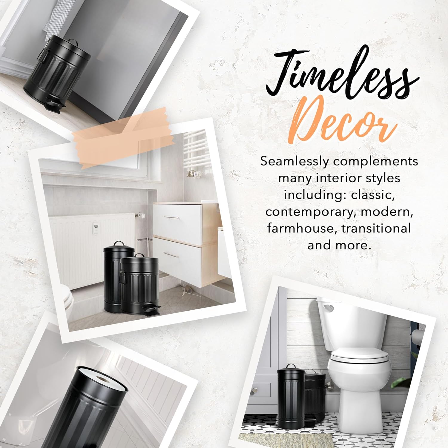 Transform your bathroom into a rustic retreat with Autumn Alley’s Black Farmhouse Bathroom Set. This thoughtfully designed set features a sturdy toilet paper holder canister that stores up to three mega rolls and keeps them dry, dust-free, and ready for use. Its free-standing metal construction and charming matte black finish make it an eye-catching addition to any farmhouse, industrial, or shabby chic-themed bathroom. The retro-inspired trash can with a pedal-operated lid offers a hands-free waste disposal solution, while the removable inner bucket ensures hassle-free cleaning. Combining style and practicality, this set is built to withstand the test of time. The rustproof metal ensures durability even in damp bathroom environments, making maintenance a breeze. Whether you're aiming to add character to your bathroom, kitchen, office, or garden, this set’s versatile design fits right in, bringing both beauty and convenience to your daily routine. Explore the rest of Autumn Alley’s farmhouse collection to complete the charming, rustic look you’ve been dreaming of.