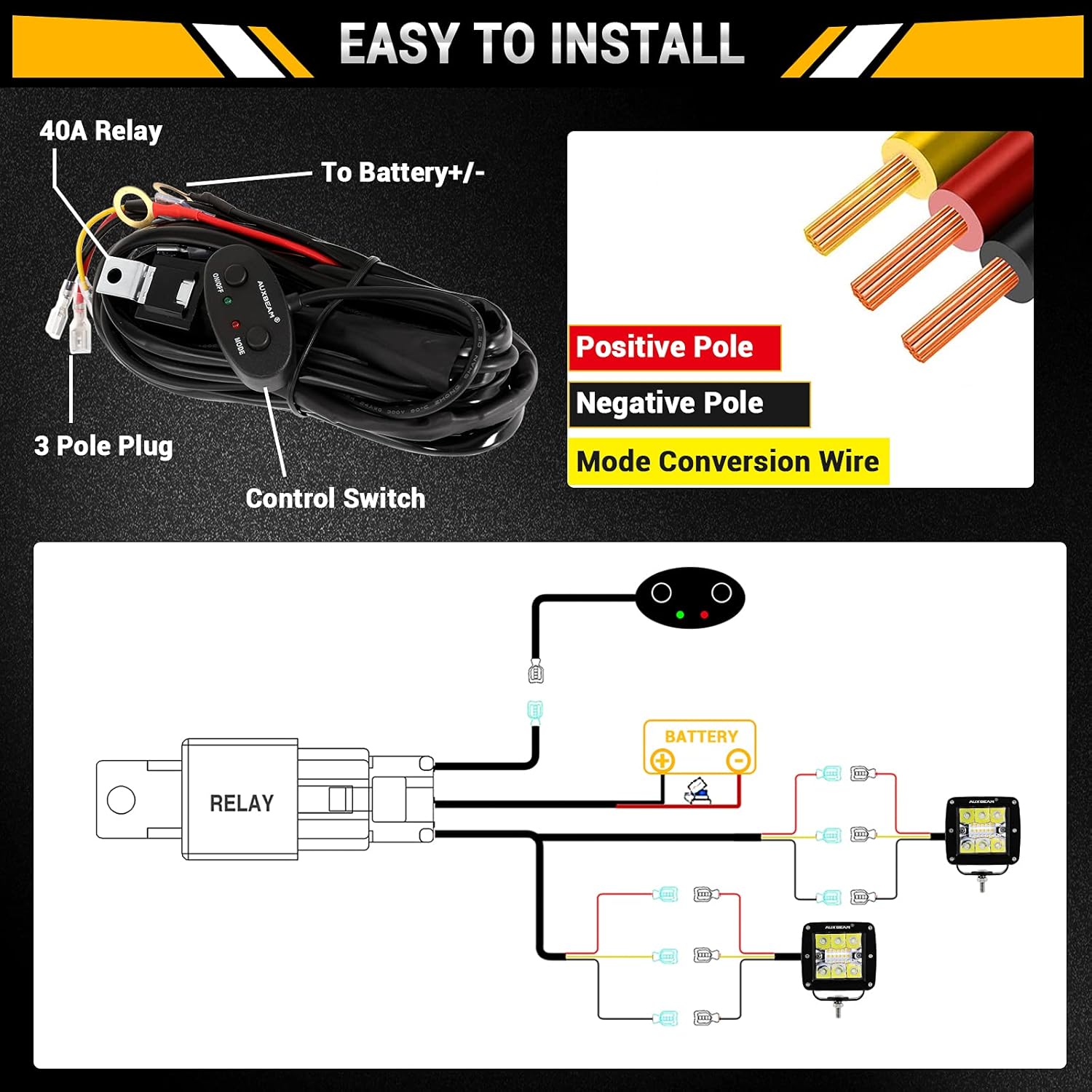 | Included Components | 1 x 10FT Wiring Harness Kit, 1 x Product Manual & Sticker, 2 x Amber White Cube Light, 2 x Installation Accessories, Two-year maintenance service |