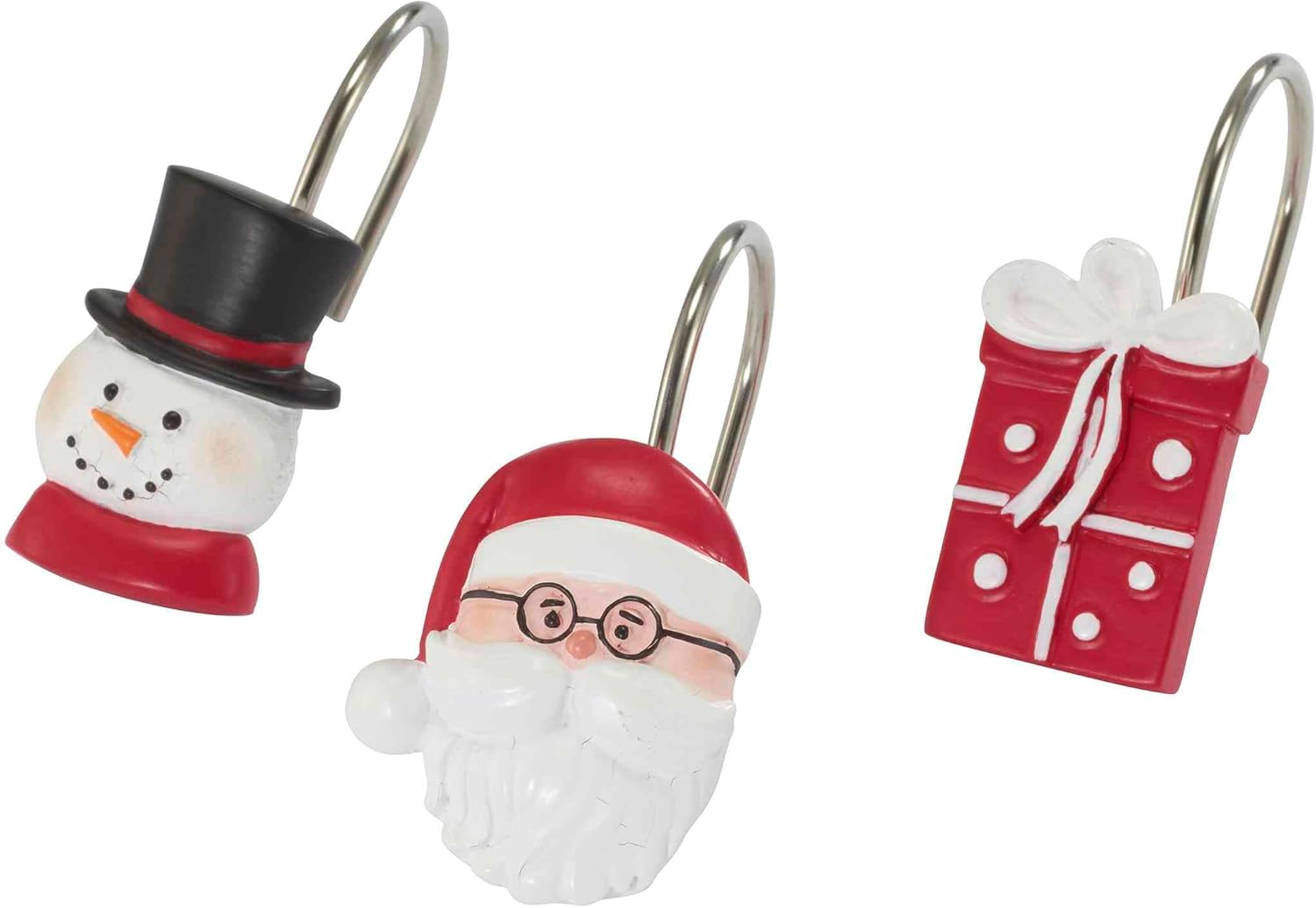 The Avanti Ho Ho Ho White Embroidered Decorative Hand Towel 2-Pack features a happy Santa with black glasses holding a bag full of toys. "Ho Ho Ho" is above Santa and grey snowflakes and dots on either side. Set includes two 16" x 28" 95% cotton/5% polyester white velour towels with red border.