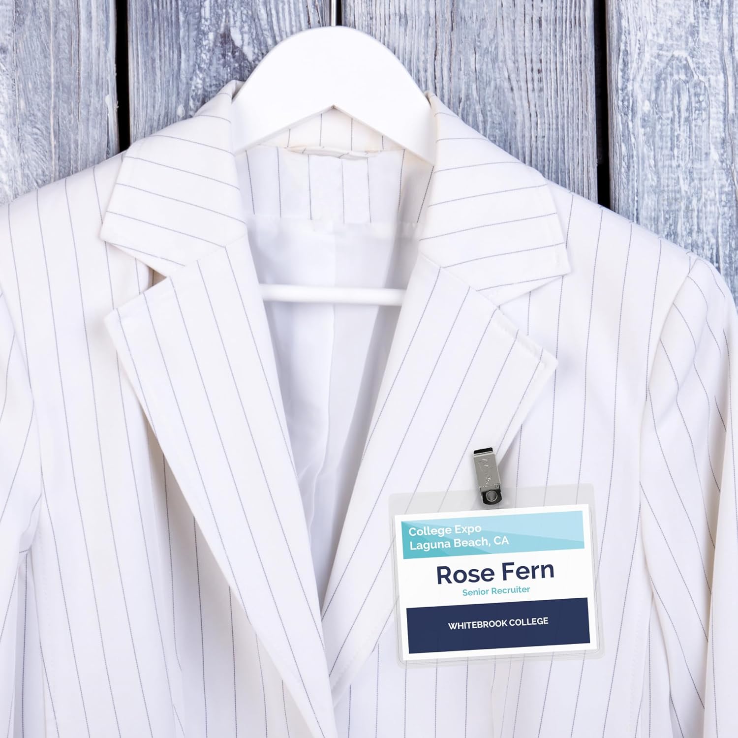 Have your name tags, staff ID cards, or visitor passes visible and accessible with Avery 2923 clip-style badge holders. This pack of 100 badge holders with clips is ideal for permanent or temporary identification. Each reusable name badge holder is made from heavyweight PVC plastic that is durable enough for everyday use. The Secure Top name badge design secures your card or insert in place, while the clear plastic badge window allows unobstructed visibility without needing to remove inserts from the holder. Each name badge holder features a garment-friendly clip to attach to your clothing without damaging the fabric. These badge card holders are also compatible with Avery Badge Inserts 5390 and 5392 (inserts sold separately), making them great for custom name tags for meetings and events, name tags for kids, and more. The size is also perfect to use as vaccine card holders (vaccine card sizes may vary, so please measure your card first to confirm fit). This item comes with 100 plastic name badge clips. Please Note: PVC plastic is smudge-resistant with a variety of inks but can potentially smear if used with laser-printed toner.