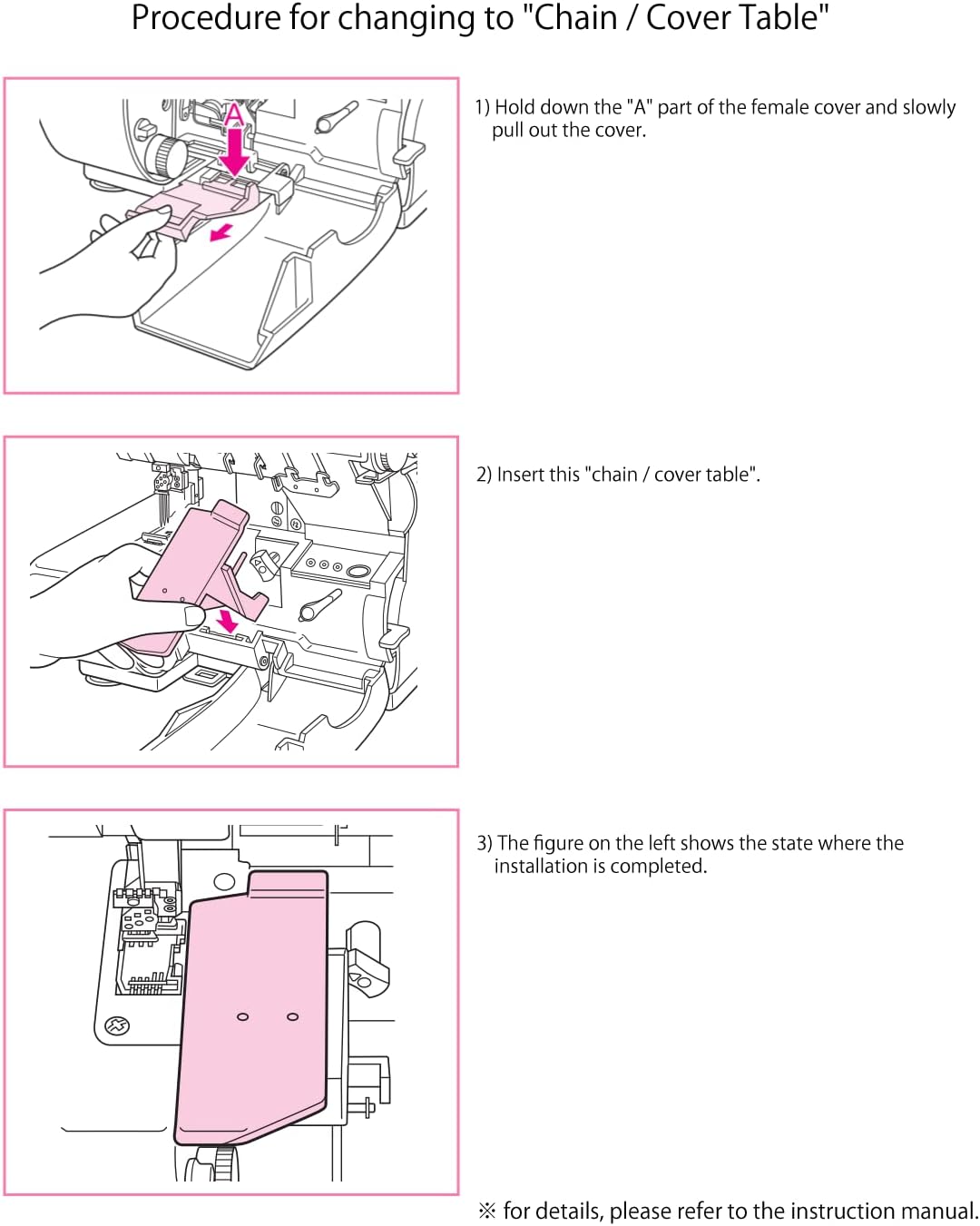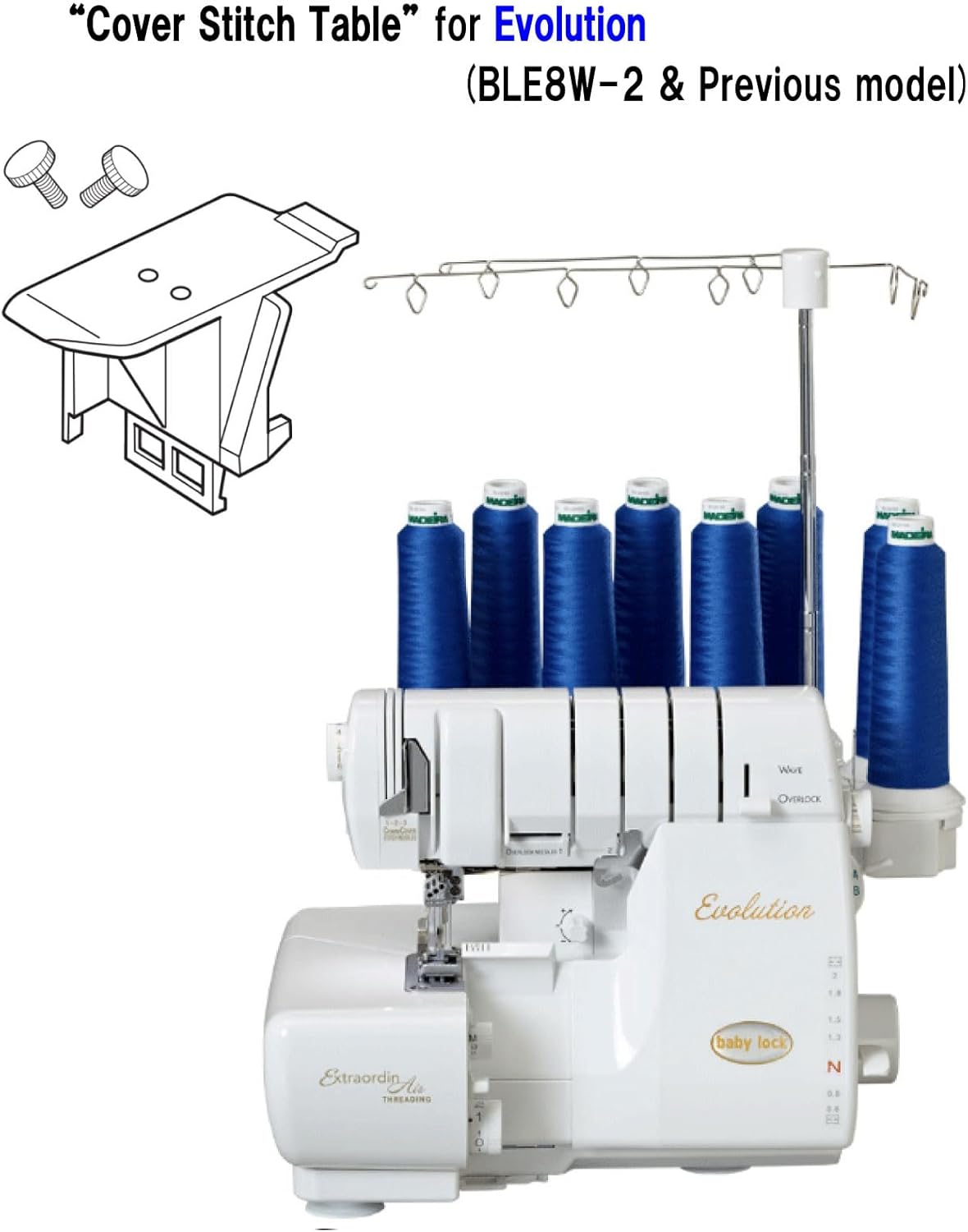 This table is for sewing chain stitch, cover stitch, or triple cover stitch. In that case, remove the normal female cover and replace it with this table. * When sewing any of chain stitch, cover stitch, and triple cover stitch, it is necessary to replace the needle and presser foot. Please refer to the manual for details. The machines that can be used are for Evolution (BLE8W-2) and Evolve (BLE8W) only. It cannot be used with other Serger machines. Please be careful.
