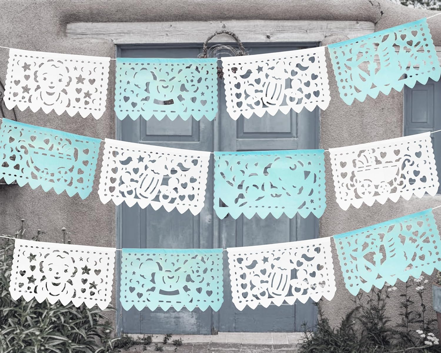 Light Blue and White Baby Shower Papel Picado Banner Pack made from tissue paper. You will receive a set of 5 papel picado banners. Each banner measures 12feet long. Each banner includes designs with babies, hearts, rocking horses, baby bottles and more!