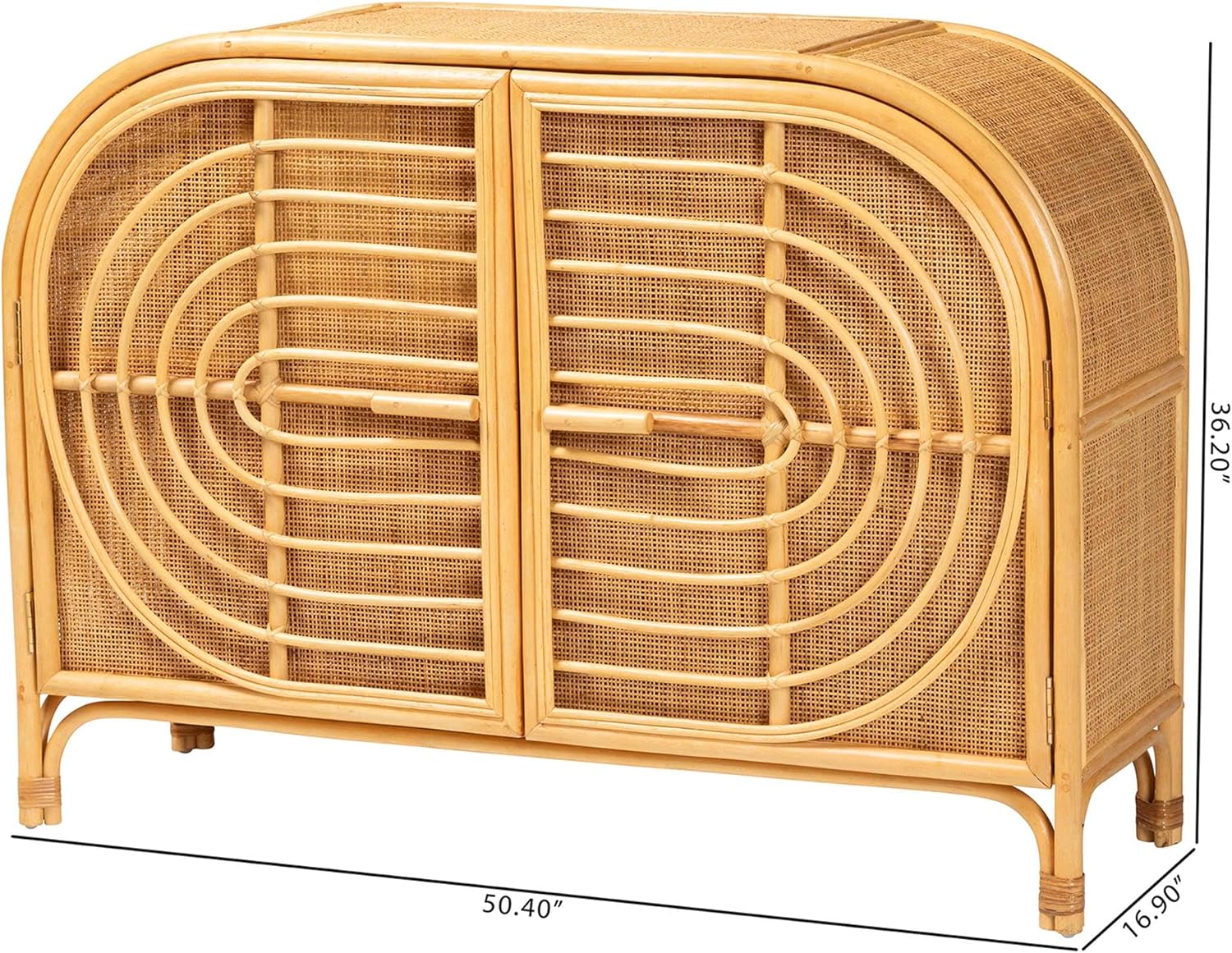 Refresh the potential of your space with the exotic grace and versatility of the Ovalet sideboard. Made in Indonesia, this bohemian piece is handcrafted from natural rattan. The doors open to reveal two spacious shelves perfect for organizing a variety cookware and other utensils. The Ovalet will arrive fully assembled and features woven rattan door fronts embellished with a smooth geometrical design for an eye-catching display. Exuding tropical elegance, the Ovalet sideboard invigorates the mood of any kitchen. Rattan is a product of nature and may have variations in areas such as, but not limited to, color, pattern, grain and texture. The hair-like strands of rattan/rattan-fiber are common due to the nature of the material.