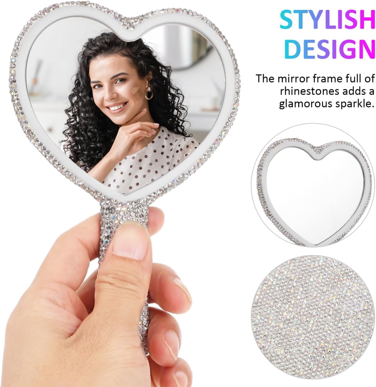 Features-Color:sliver-Material:ABS, rhinestone Heart-Shaped Design: Our rhinestone mirror features a stunning heart-shaped design adorned with rhinestones, adding a touch of glamour and elegance to your beauty routine Versatile and Decorative: This handheld cute mirror heartshape is not only practical makeup tool but also a beautiful room decoration. Its romantic girly design makes it a suitable addition to your vanity or dresser Portable and Convenient: With its compact size and lightweight design, this heart-shaped mirror is to carry and store, making it ideal for travel or daily use Sturdy Materials: Made of sturdy rhinestone and glass material, this bling hand mirror with hand is built to last. The clear mirror provides a distortion reflection, ensuring accurate makeup application every time Wonder Choice: With its elegant and unique design, this rhinestone heart mirror handheld makes a wonderful present r women on any occasionPackage Including1 x handheld cute mirrorThe handheld mirror features a romantic heart-shaped design adorned with rhinestones, adding a touch of elegance and luxury to your beauty routine. Its compact size of 6.29 x 4.33 x 0.19 inches and lightweight construction of 45.27g make easy to carry and use, for travel or daily makeup application. The single-sided high-definition mirror ensures , ideal for precise tasks like makeup application, eyebrow shaping, or lash adjustments. Crafted from abs material and sparkling rhinestones, this mirror combines functionality with style, making a who appreciate beauty and convenience. Suitable for various occasions, such as home use, travel, or as a charming addition to your vanity setup.