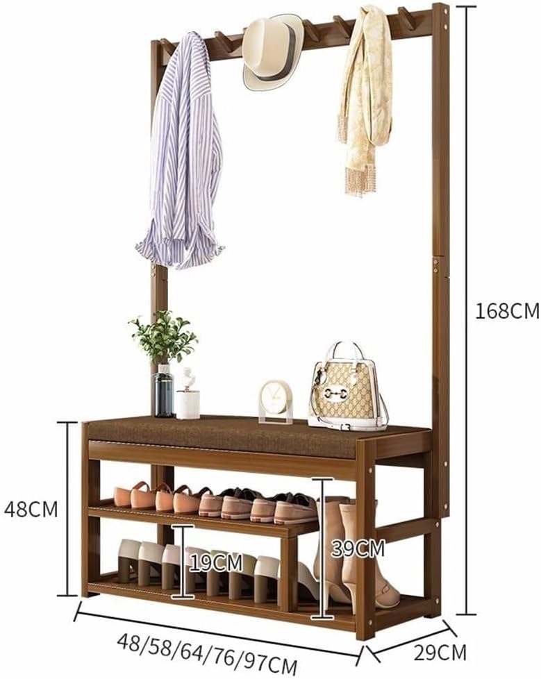 Enhance your entryway, bedroom, or mudroom with this stylish and functional Bamboo Hall Tree featuring an upholstered shoe bench and ample storage options. Made from durable, bamboo, this versatile organizer offers five strong hooks for coats, hats, and scarves, alongside two spacious shoe shelves and a covered compartment perfect for shoe care accessories or small items. The cushioned bench is filled with high-density foam and wrapped in a removable, washable linen cover, providing a comfortable seating area while changing shoes. Designed with a retro aesthetic, it seamlessly blends with various decor styles while maximizing your space. Available in multiple sizes (50 to 100 cm length), this hall tree supports up to 100 kg in total, ensuring lasting stability. Easy to assemble and maintain, it’s a perfect combination of beauty and practicality to keep your home tidy and welcoming.
