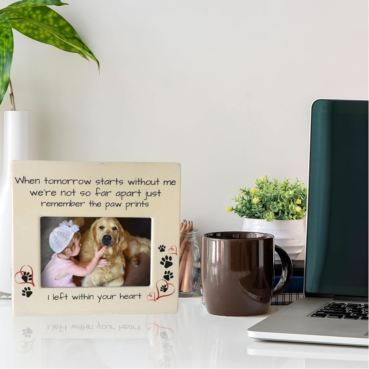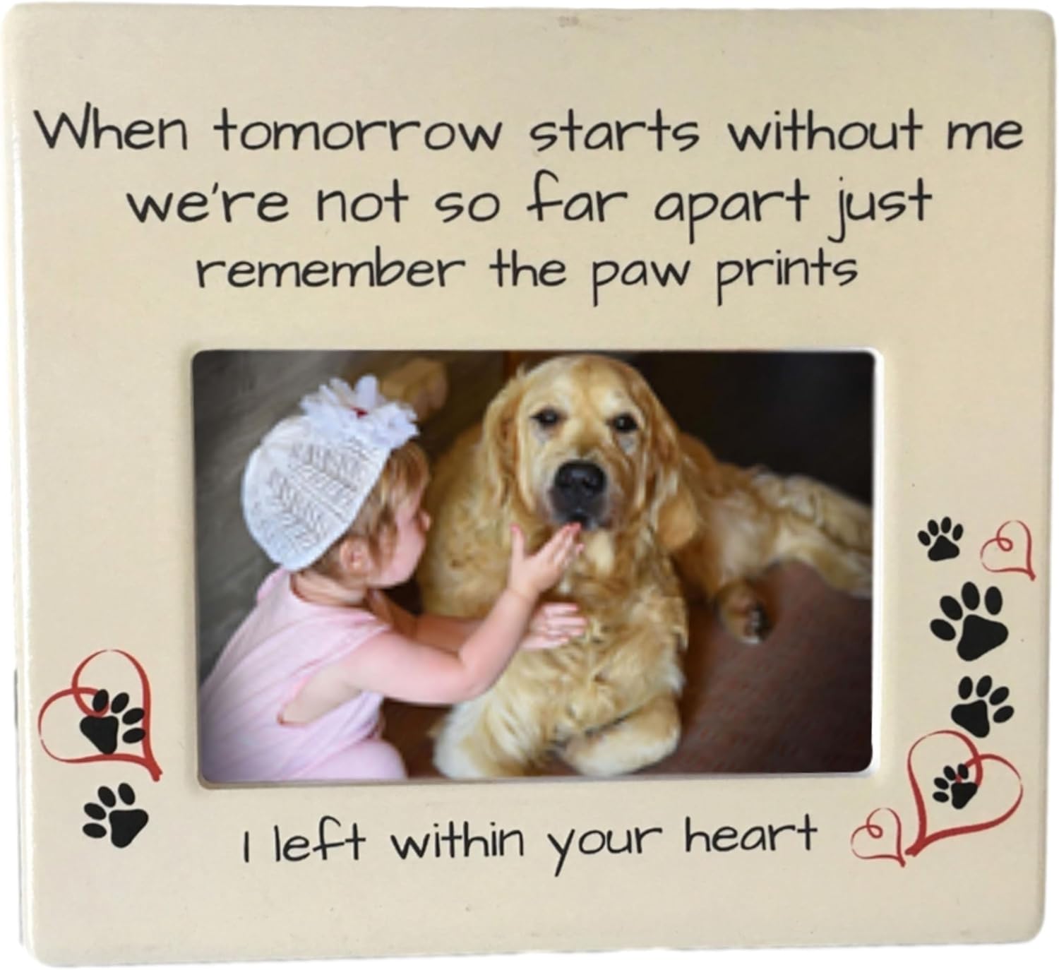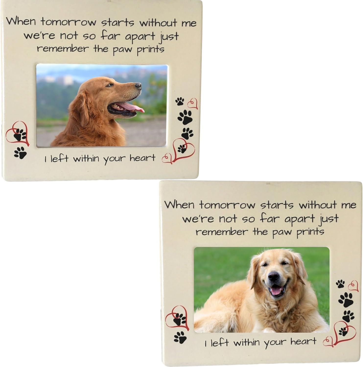 Pet memorial gifts. The pet memorial picture frame measures 8"W X 7.25"H and comes with an easel back to sit nicely on a desk or a bookshelf. Holds a 4"X6" photograph. Set of 2