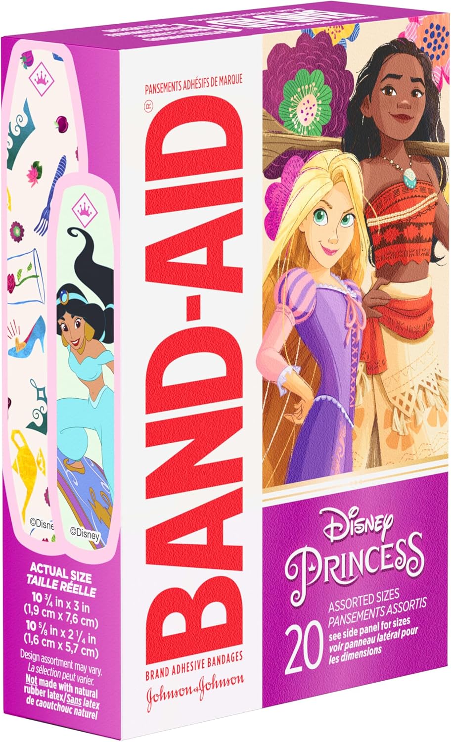 Care for your child's minor wounds and bring a smile to their face with Disney Princess Band-Aid Brand Adhesive Bandages. These first aid adhesive bandages for kids and toddlers cover minor wounds, cuts and scrapes to deliver daily wound protection. Perfect for kids and toddlers, each individually wrapped sterile bandage features Disney Princess characters from Aladdin, Rapunzel, Moana and more to make first aid more fun for your child. As part of your essential first aid supplies, the Disney decorated bandages protect minor wounds from contact with germs and dirt that may cause infection and delay healing. These sterile kids' bandages come in various sizes and are comfortable to wear thanks to a non-stick pad that won't adhere to the wound. The box contains individually wrapped sterile first aid bandages. Disney