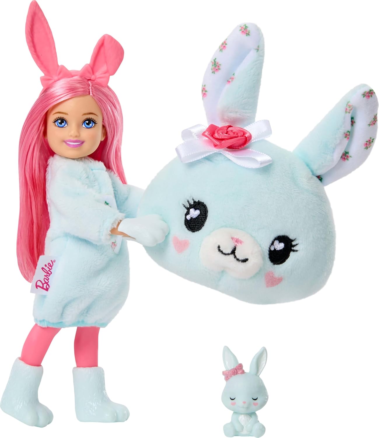 Barbie Cutie Reveal Cuddly Series Chelsea dolls offer the cutest wow moments as kids open the package to find six surprises! One of three different characters can be found -- there's a Kitten, Bunny and Lamb, all celebrating spring with sweet pastel colors. Which doll will you reveal? Remove the plush costume to discover a Chelsea small doll. Continue finding more surprises like a skirt and mini pet friend that matches the doll's costume. Flip the plush top for an over-sized jacket and the costume head for a mini pet bed! Use water for even more cuteness with repeat color-change transformation on the mini pet's face! Kids will love discovering all the surprises in the adorable Barbie Cutie Reveal Cuddly Series. Each doll sold separately, subject to availability. Dolls cannot stand alone. Colors and decorations may vary.