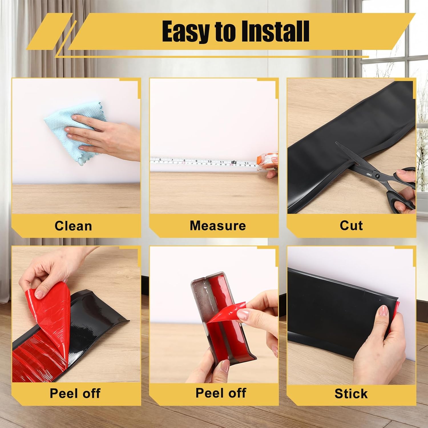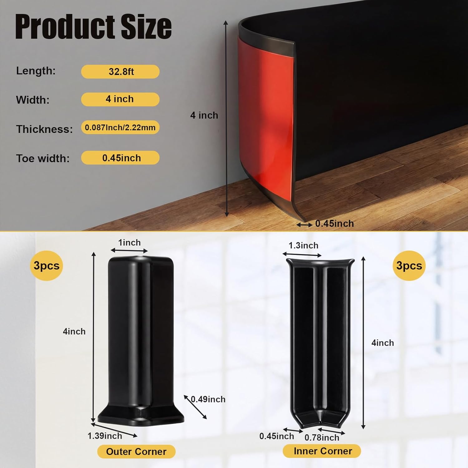 Features: The vinyl baseboard trims can stick to almost any smooth surface, such as: tile, wood flooring, marble floor, lacquered walls, glass, etc. Baseboard trims are made of upgraded vinyl, which is less likely to leave scratches or wear. Material: pvc,ABS Color: black Size: 4 Inch x 32.8 Feet Package includes: 4 Inch x 20 Feet baseboard, 6 Corner Notes: Manual measurement, please allow slight errors on size. The color may exist a slight difference due to different screen displays. Our products have strong adhesive, please do not stick them on the paper cabinet, paint cabinet, in case of damage to the furniture