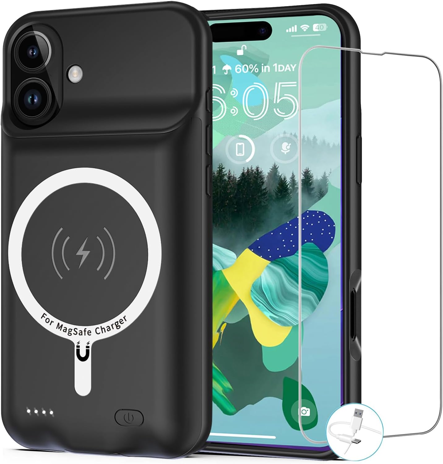 Kindly Note: 1. Full protection to corners and sides, protecting your iPhone from drops and impacts. Note: not including protect phone screen. 2. Premium battery cells are used to ensure power, safety and reliability. 3. The battery case is only for iPhone 16 Pro, Other models are not supported. 4. When connecting the Charging cable to the battery case with the phone, the phone will charge first, and when the phone is fully charged, the battery case will be charged. 5. The battery case supports wireless charging. 6. Smart battery case intelligently stops charging when your iPhone power is 100%. 7. 100% support CarPlay and car charger and wireless charging. How to use: 1. Bend the top of the product to completely put the phone into the battery case. 2. Press the power button of the battery case, and it will start charging your iPhone 16 Pro. 3. Press the power button again, the charging case will stop charging. Product specifications: 1. Input: 5V/1A 2. Out put: 5V/1A 3. Capacity: 10000mAh 4. Sleek, Low-Profile design; Rechargeable up to 1000 times Package Included: 1 x Battery Case 1 x Tempered Glass Screen Protector 1 x User Manual 1 x Charging cable