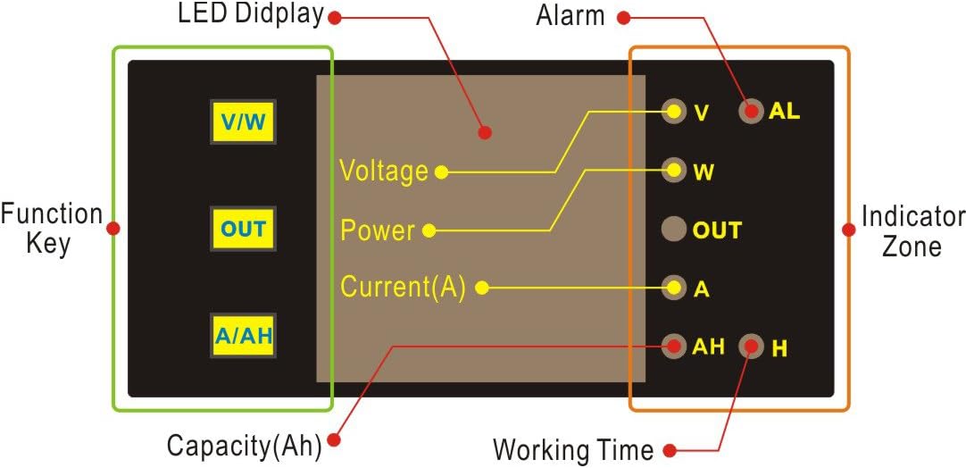 The DCM9040 Battery Monitor The unit is designed to monitor performance most kind of battery systems, it continuously monitors voltage, discharge current, number of power, consumed amp hours, these information leads to more efficient use of the battery, which can enhance battery life and reduce the risk of failure. Combines many functions in one, Dual display. *Voltage (V), Power (W), Current (A), Ampere-hour (Ah), Working Hours (H). Equipped with programmable alarm, to run a generator when needed or to turn off devices when the reading reaches a set threshold (relay required). An alarm is acknowledged when a button is pressed. On most of the DCM9040's readings an alarm can be triggered when the value reaches a set threshold. *[OVP] Over Voltage protection *[LOP] Low Voltage protection *[OCP] Over Current protection *[OAH] Over Charge protection *[OPP] Over Power protection *[OFT] Over Time protection Flexible On-line calibration function, calibrate Voltage and amps reading easily. 4 digits LED, High accuracy Measure currents up to 400 amps, capacity up 999 amp hours. No need isolated power. Technical Specification Power Supply: 5~40V Measuring range: 0-200V/0-1000A (external power), 5-40V/0-1000A (internal power) Display Type: 7 segment 4 digits Red LED Sampling rate: 5 readings per second Accuracy: Volt ± 0.1% + 2byte / Amp ± 0.5% + 3byte Resolution: 0.01V, 0.01A, 0.01W, 0.01Ah, 0.01H Dimensions: 79.0mm x 43.0mm x 25.0mm Package including 1x Combo Meter 1x Expansion board with cable 1x Shunt 1x Installation instruction