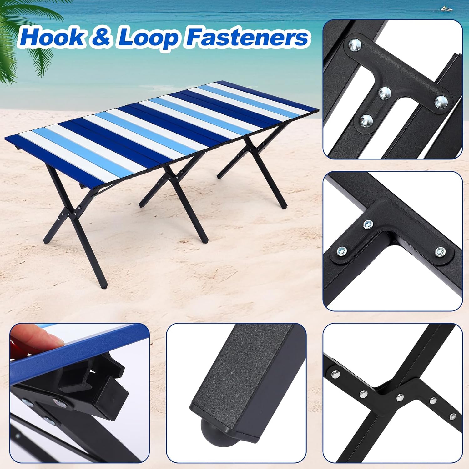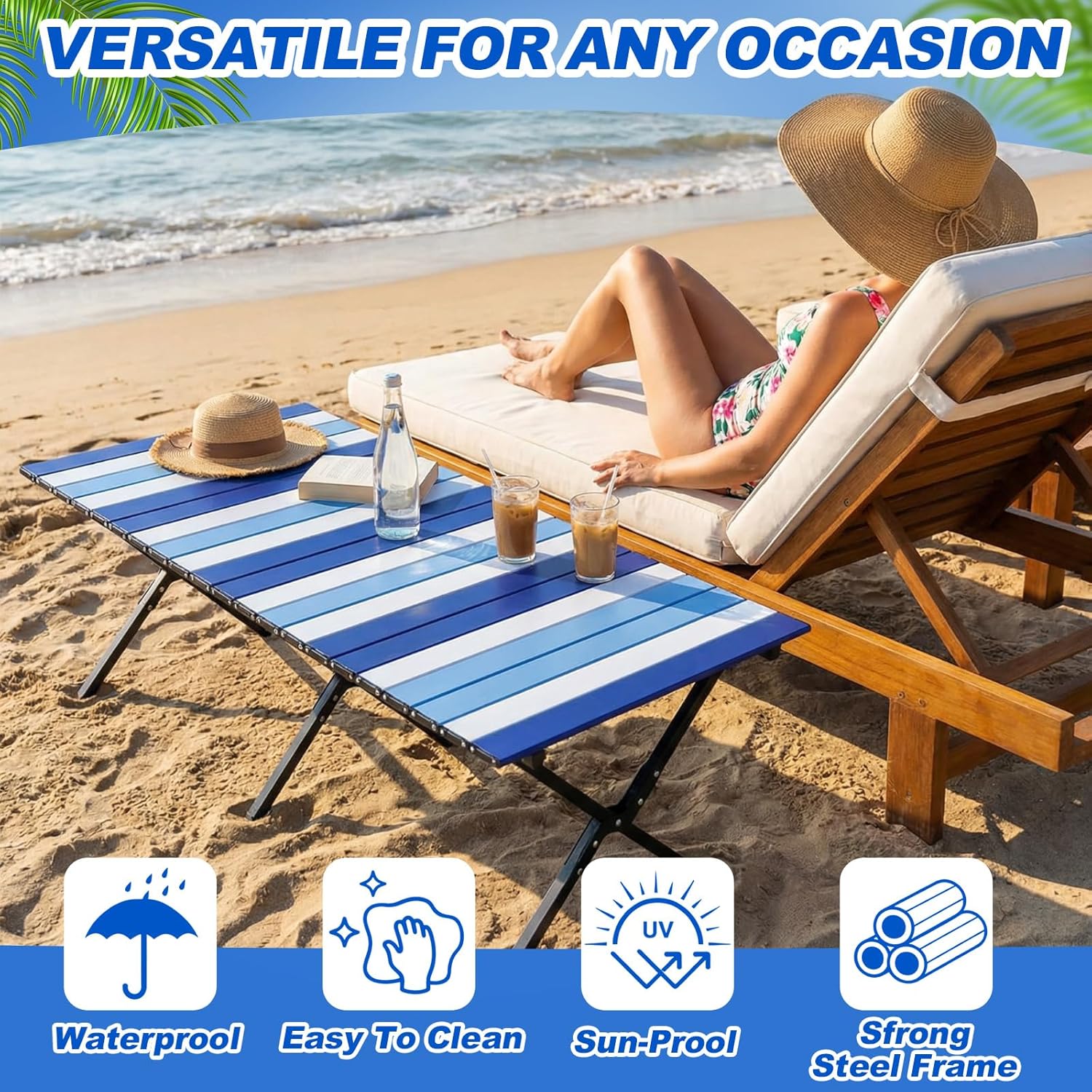 Features: All-Weather Durability: Whether you're facing sunny skies or unexpected showers, this table is built to last in any weather condition. Its weather-resistant design ensures long-lasting performance and reliability. Ideal for Various Occasions: Versatile and space-saving, this folding table is ideal for beach picnics, camping trips, tailgating, and more. Its 16x11x5 inches unfolded dimensions provide ample surface area for meals, games, or any other activity you have planned. Specifications: Material: aluminum Color: navy Blue Size: 48x24x18 inches Package includes: 1 pcs Notes: Manual measurement, please allow slight errors on size. The color may exist a slight difference due to different screen displays