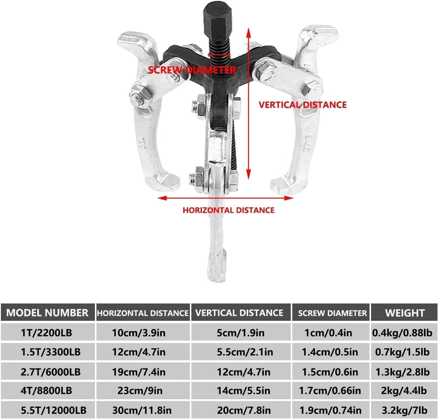 Load capacity: 5.5 tons/12,000 poundsHorizontal pull distance: 11.8 inches/30 cmVertical pull distance: 7.8 inches/20 cmWeight: 3.2 kg/7 poundsNumber of claws: three-claw pullerDimensions: 28*16*16 cm/11*6.3*6.3 inches