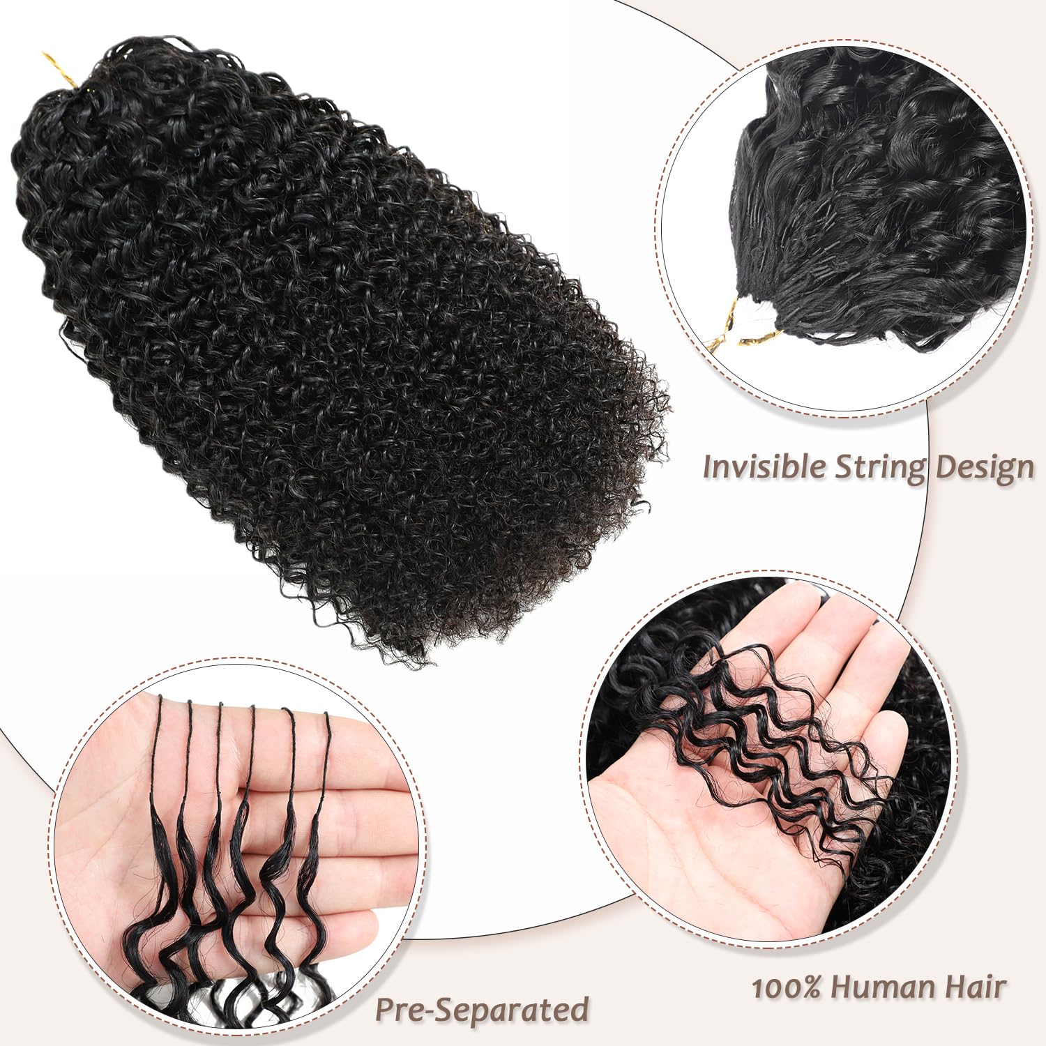 • HAIR QUALITY: 100% real human hair extensions designed for crochet braiding, offering natural-looking kinky curly texture. lt feels soft and smooth, resists tangling, has no odor, and is easy to maintain. Each strand is as liaht as a feather
