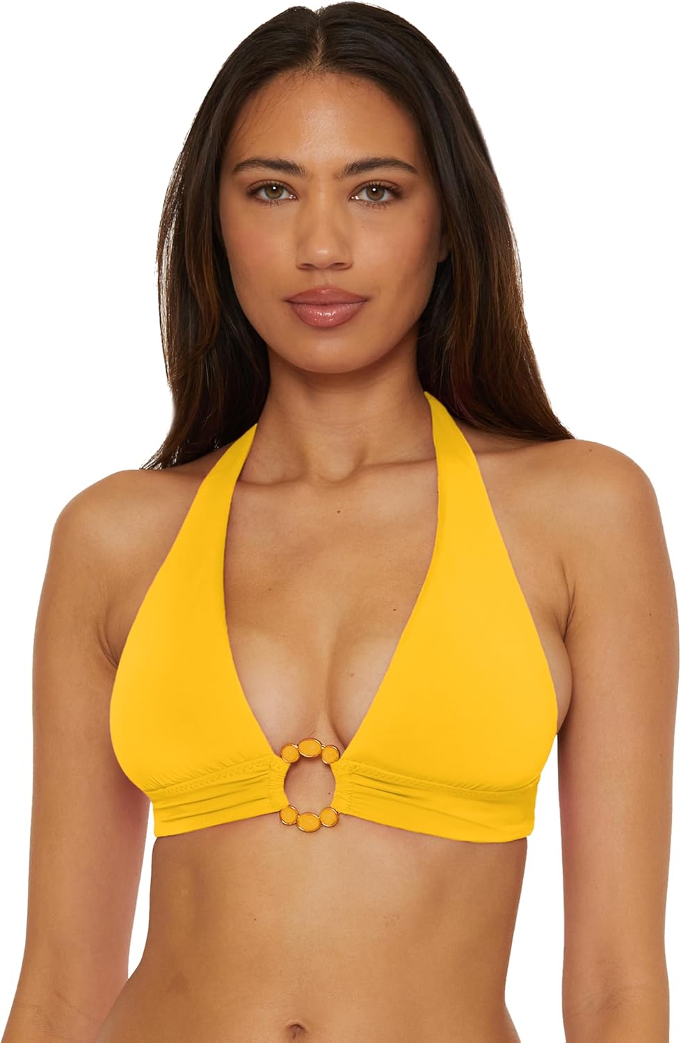 Add a touch of elegance to your swimwear collection with the BECCA Marble Canyon Women's Halter Bikini Top. Crafted from 83% Nylon and 17% Spandex, this top offers a comfortable and flexible fit for all your summer adventures. The gold ring with marbleized inlay stones at the center front adds a luxurious detail, while the adjustable soft ties at the neck and back provide a customizable fit. With removable soft cups for versatile bra support, this bikini top is perfect for women with big busts or those seeking extra comfort. Pair it with your favorite swimwear separates for a chic and stylish beachwear look this season.