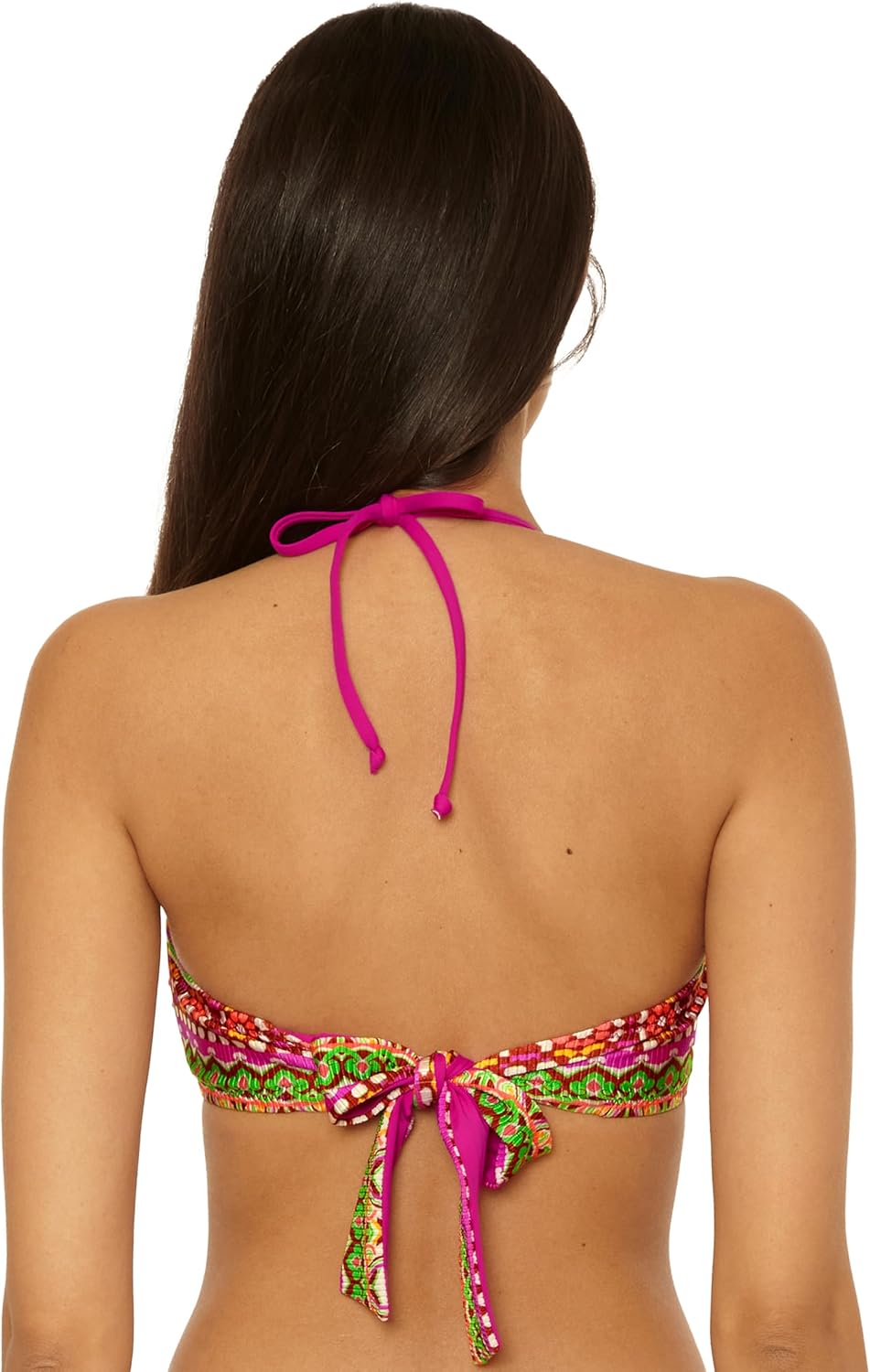 Make a bold statement poolside or on your next getaway with the BECCA Moroccan Tile Bandeau V-Wire Bikini Top. This shirred bandeau-style bikini top features a luxe gold V-wire at the center front with a beaded cap for a polished, eye-catching finish. Crafted from 85% Nylon and 15% Spandex, the shiny rib texture offers a sleek look with just the right amount of stretch and structure. Built-in molded cups and side seam stays deliver lasting support and shape, making it an ideal option for ladies needing bra support or shopping for big bust bikini tops. An adjustable and removable contrast neck tie lets you switch between a halter and strapless look, while the wide soft tie back keeps things comfortable and secure. The placement inset yoke at the neckline and vibrant stripe medallion tile print give this top a chic, boho-inspired vibe perfect for summer fashion and resort wear. Whether you’re mixing and matching swimwear separates or planning a flattering option for maternity swimwear or plus size bikini looks, this piece delivers comfort, style, and versatility. A standout among bikini tops for women, it’s perfect for building your vacation, beachwear, or bridal bathing suit collection.