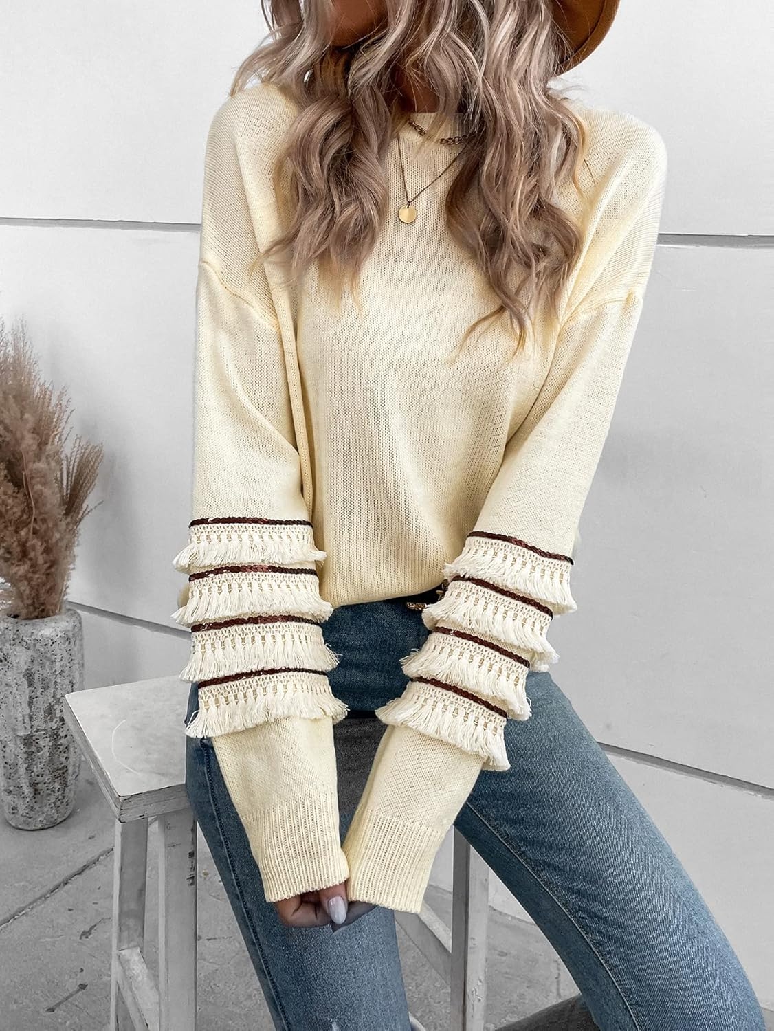 SBicep Length : 14.6 inchBust : 43.3 inchCuff : 7.1 inchLength : 22.8 inchShoulder : 22 inchSleeve Length : 19.7 inchMBicep Length : 15.1 inchBust : 44.9 inchCuff : 7.5 inchLength : 23.2 inchShoulder : 22.8 inchSleeve Length : 19.9 inchLBicep Length : 15.9 inchBust : 47.2 inchCuff : 8 inchLength : 23.8 inchShoulder : 24 inchSleeve Length : 20.2 inchColor: ApricotStyle: CasualPattern Type: StripedDetails: FringeType: PulloversNeckline: Round NeckSleeve Length: Long SleeveSleeve Type: Drop ShoulderLength: RegularFit Type: Regular FitFabric: Slight StretchMaterial: FabricComposition: 100% AcrylicCare Instructions: Machine wash or professional dry cleanSheer: Semi-Sheer