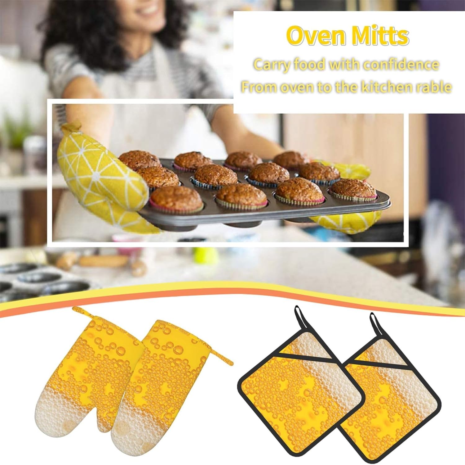 Upgrade your kitchen essentials with this oven mitts and pot holders set, designed for safe and comfortable handling of hot cookware. The set includes 2 heat-resistant oven mitts and 2 pot holders with pockets, making it a practical choice for daily cooking, baking, grilling, and microwave use.Crafted from high-quality polyester with thick insulated padding, these kitchen gloves deliver reliable heat protection up to 260°C. The soft quilted lining ensures comfort and flexibility, while the silicone palm design enhances grip and control when handling hot pots, pans, and trays.The non-slip silicone surface provides added stability, giving you confidence when moving hot cookware. Waterproof inner and outer layers make cleaning simple—just wipe clean or hand wash and air dry for easy care.Each piece features a convenient hanging loop for organized storage and quick access in your kitchen. Stylish and functional, this oven mitts set also makes a thoughtful gift for family and friends on holidays, housewarmings, and special occasions.