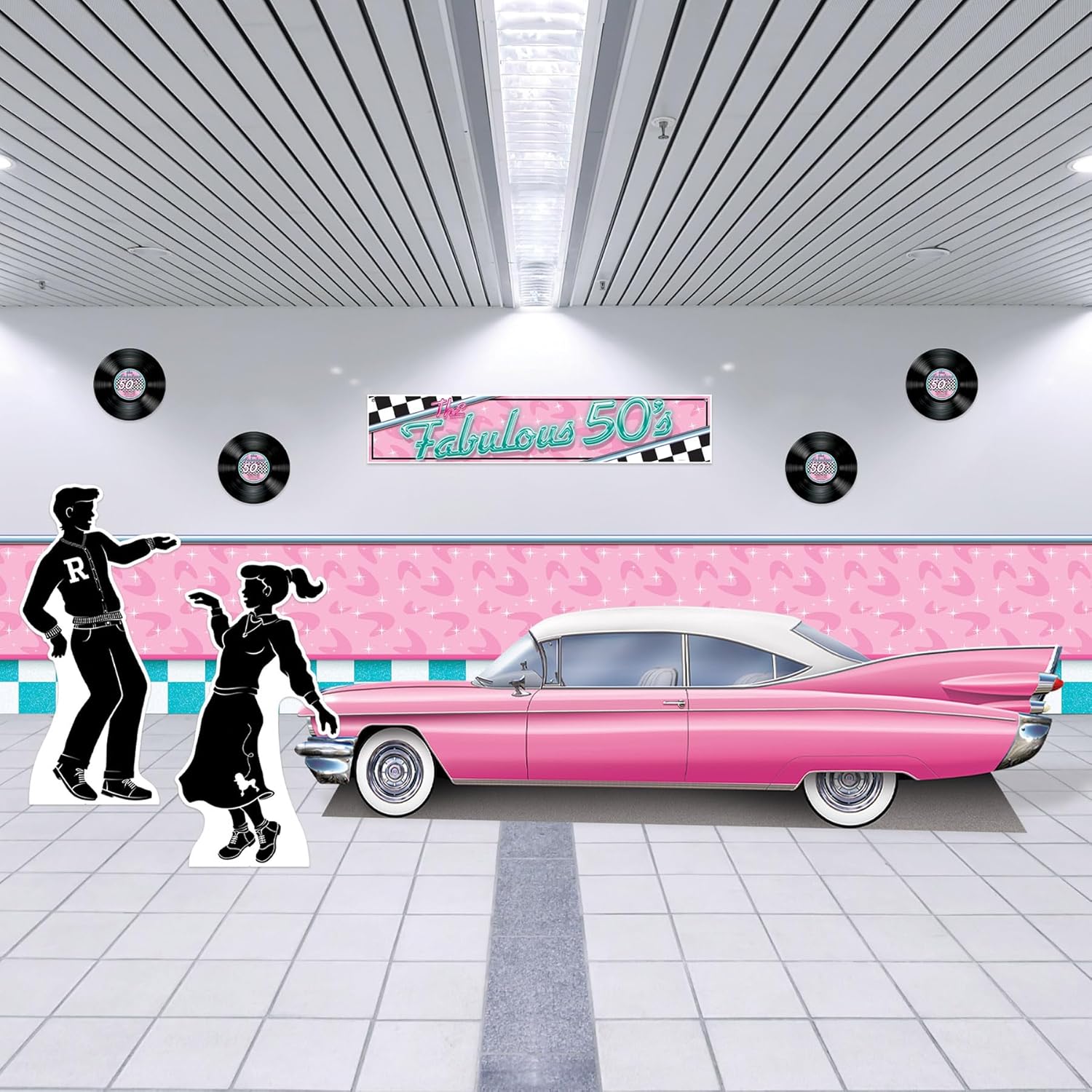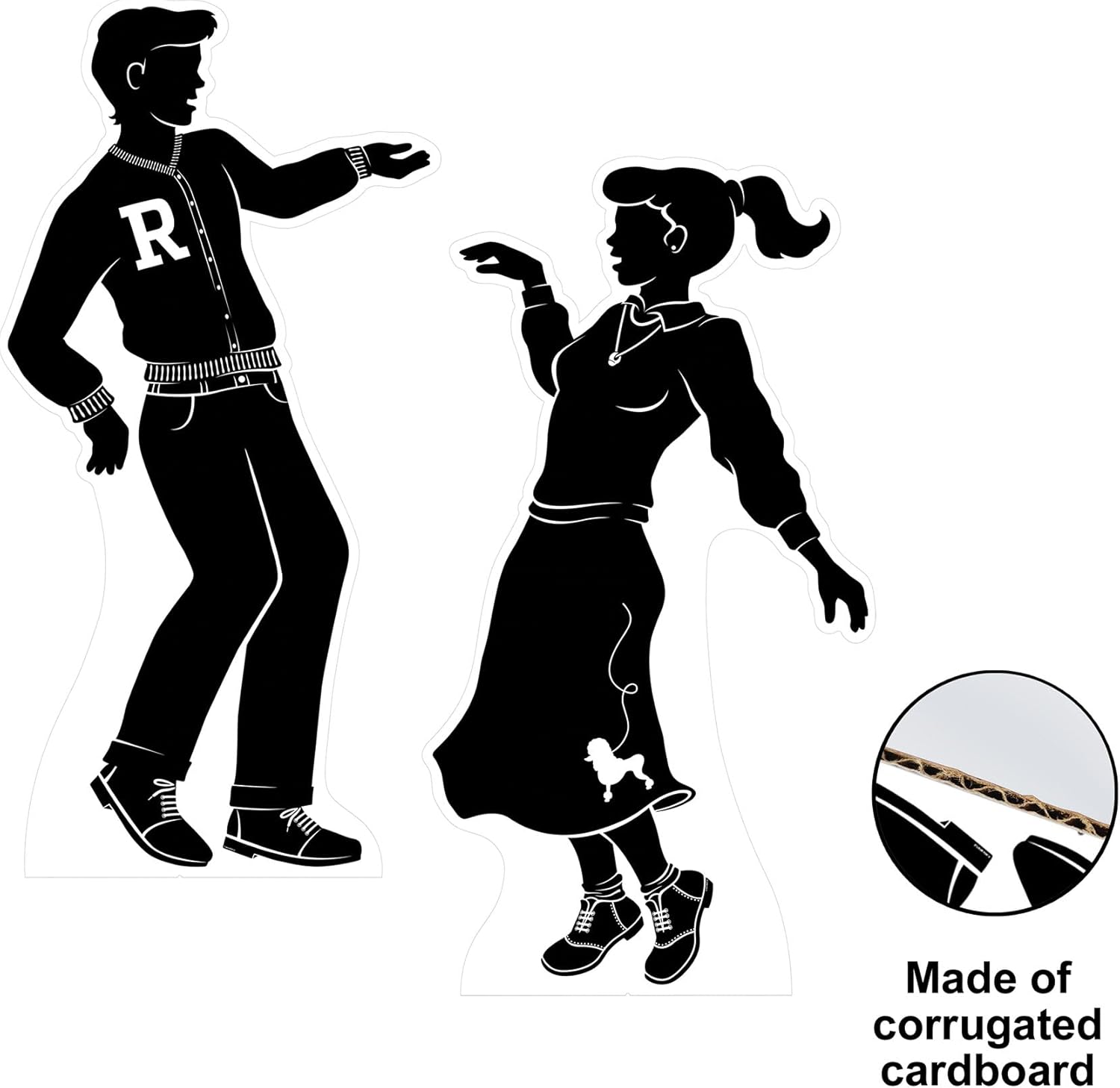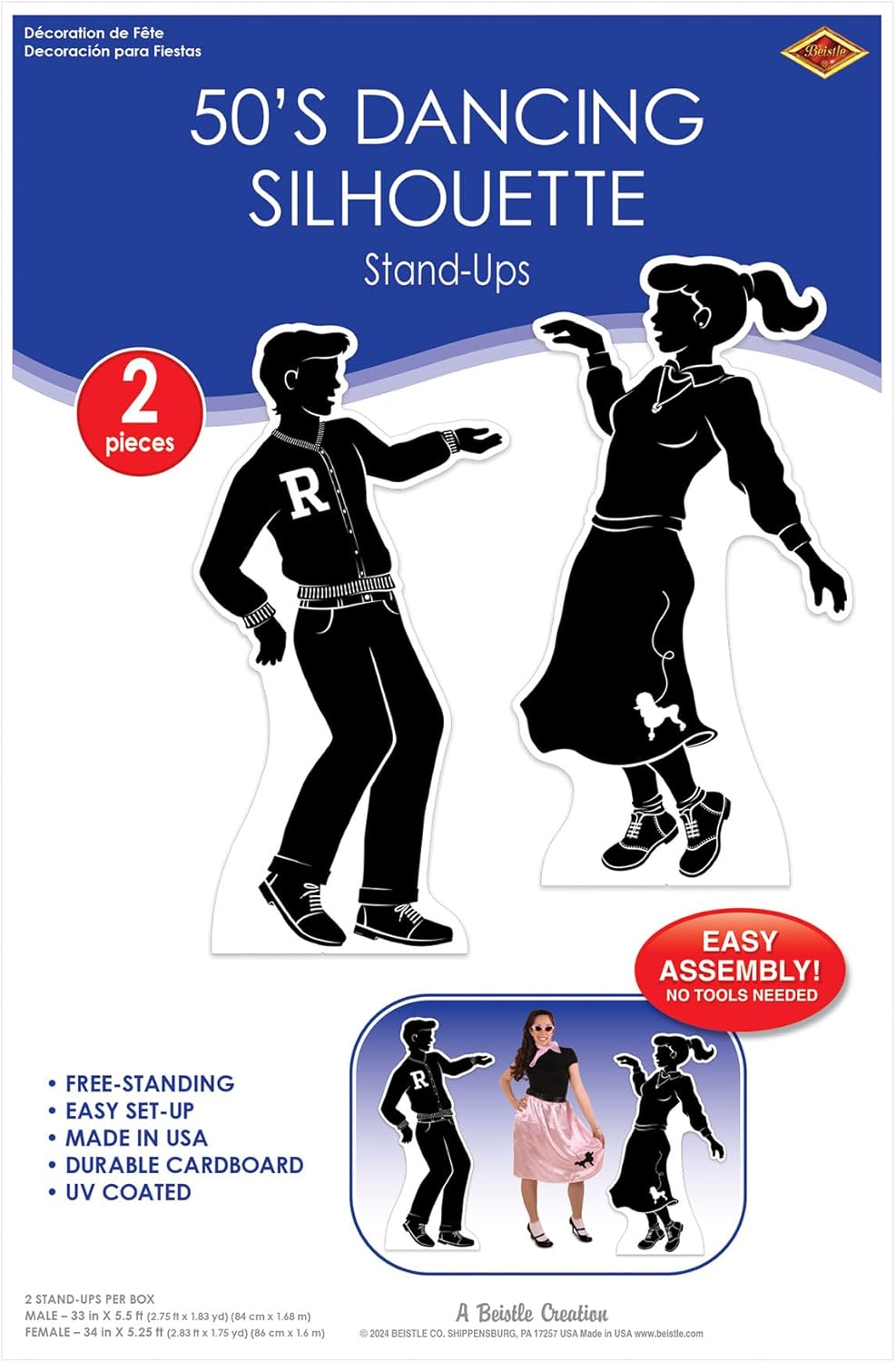 Beistle 50's Dancing Silhouette Stand-UpsProudly Made in the USAAdd the perfect touch of 1950s nostalgia to your event with the Beistle 50's Dancing Silhouette Stand-Ups. These life-sized, retro-inspired cutouts depict a dancing couple, ideal for creating an authentic vintage atmosphere at your 50s-themed party or sock hop event. Crafted from durable corrugated cardboard, these stand-ups are sturdy enough to last through your entire celebration. The boy measures 5 feet 6 inches by 33 inches, while the girl stands at 5 feet 3 inches by 34 inches. They’re easy to assemble with attached easels, ensuring stability without complicated setup.Their fun, nostalgic design makes them perfect for a photo backdrop or decorative centerpiece at retro celebrations, school dances, or era themed birthdays. Whether you’re creating a lively dance floor setting or using them as photo props, these silhouettes instantly transport guests back to the rock ‘n’ roll era. With their striking black-and-white design, these stand-ups evoke the spirit of the 50s decade and are perfect for creating memories with friends and family.