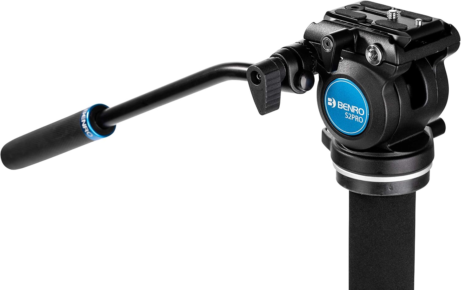The Benro A38FDS2PRO is a travel-friendly flip lock video monopod provides a 5.5 lb.(2.5kg) payload capacity ideal for small cameras and smartphones. The S2 PRO Video Monopod Kit features a 3-leg locking base with ball joint for smooth and stable shots along with reverse folding legs for compact travel. Made for small cameras and smartphones alike, the S2 PRO is a versatile flat base video head. The S2 PRO video head supports up to 5.5 lb/2.5kg. Equipped with a 60mm flat base with a 3/8"-16 thread, the S2 PRO is a versatile creative tool allowing you to mount the head separately on sliders, jibs, or monopods. Other features include: pan & tilt lock, fixed pan & tilt drag, bubble level and two 1/4"-20 accessory mounts for attaching monitor arms or audio recorders directly to the head. This allows you to attach accessories without needing a cage or rig to do so. Tilt range for the S2 PRO is +90°/-70°. The forward 90 degree tilt helps with table top setups. The S2 PRO also features an improved CNC machined aluminium sliding camera plate.