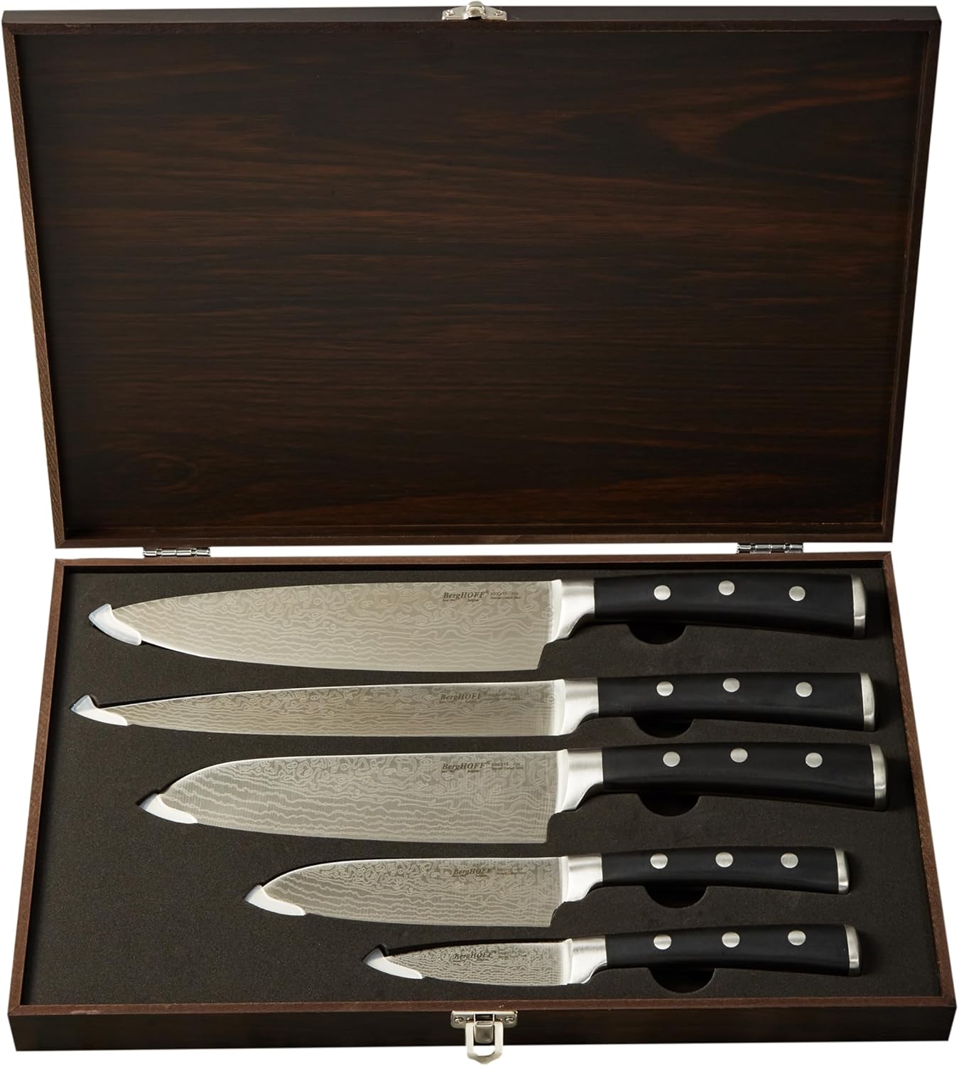 This 5 piece knife set by BergHOFF was designed for bold beauty as much as peak performance, this five-knife set with the accompanying case will make you feel like a true professional in the kitchen. Each knife features a distinctive Damascus steel pattern on precisely honed blades, perfectly balanced by a smooth, triple-riveted handle for extra strength that fits comfortably in your hand. Clean up is a breeze, simply hand-wash with warm water and soap.