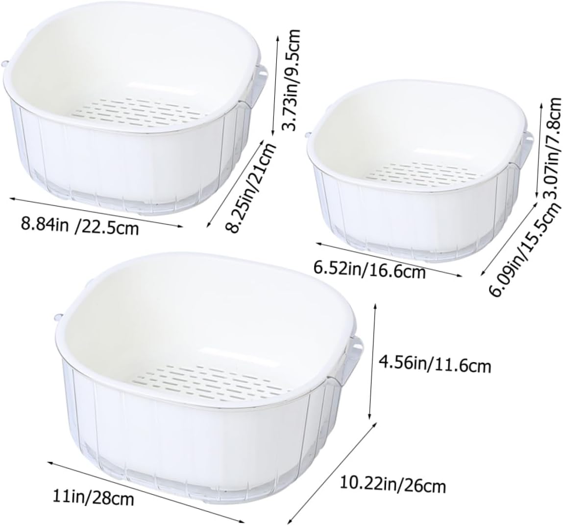 Package Include 3 x Draining Baskets Characteristics -Size:28.00X26.00X11.60cm/11.00X10.22X4.56in draining basket for fruit -Size:22.50X21.00X9.50cm/8.84X8.25X3.73in plastic draining basket -Color:White detachable drain basket -Product Info:Double drain basket -Size:16.60X15.50X7.80cm/6.52X6.09X3.07in drainage basket for food -Material:PP, PET multi-functional drain basket -Good material and , you can drainage basket. -Hollow design, fast drainage, easy to use, suitable for washing vegetables, fruits, etc fruit washing basket. -The vegetable washing basket is made of material, has a and is not easily deformed detachable basket. -This washing basket is easy to use, the drainage parts are evenly distributed, and it has a wide range of uses drainer fruits washing basin. -Share it with your friends and family, because it is practical and they will like it detachable draining baskets.Goods Descriptiondraining bowl basket This vegetable washing basket is made of good material for safe and healthy storage.drainer fruits washing basin Safe, and convenient.kitchen use washing basket It is cute and delicate.fruit This is the kitchen storage basket.detachable draining baskets This kitchen storage basket can help you store and filter vegetables and fruits